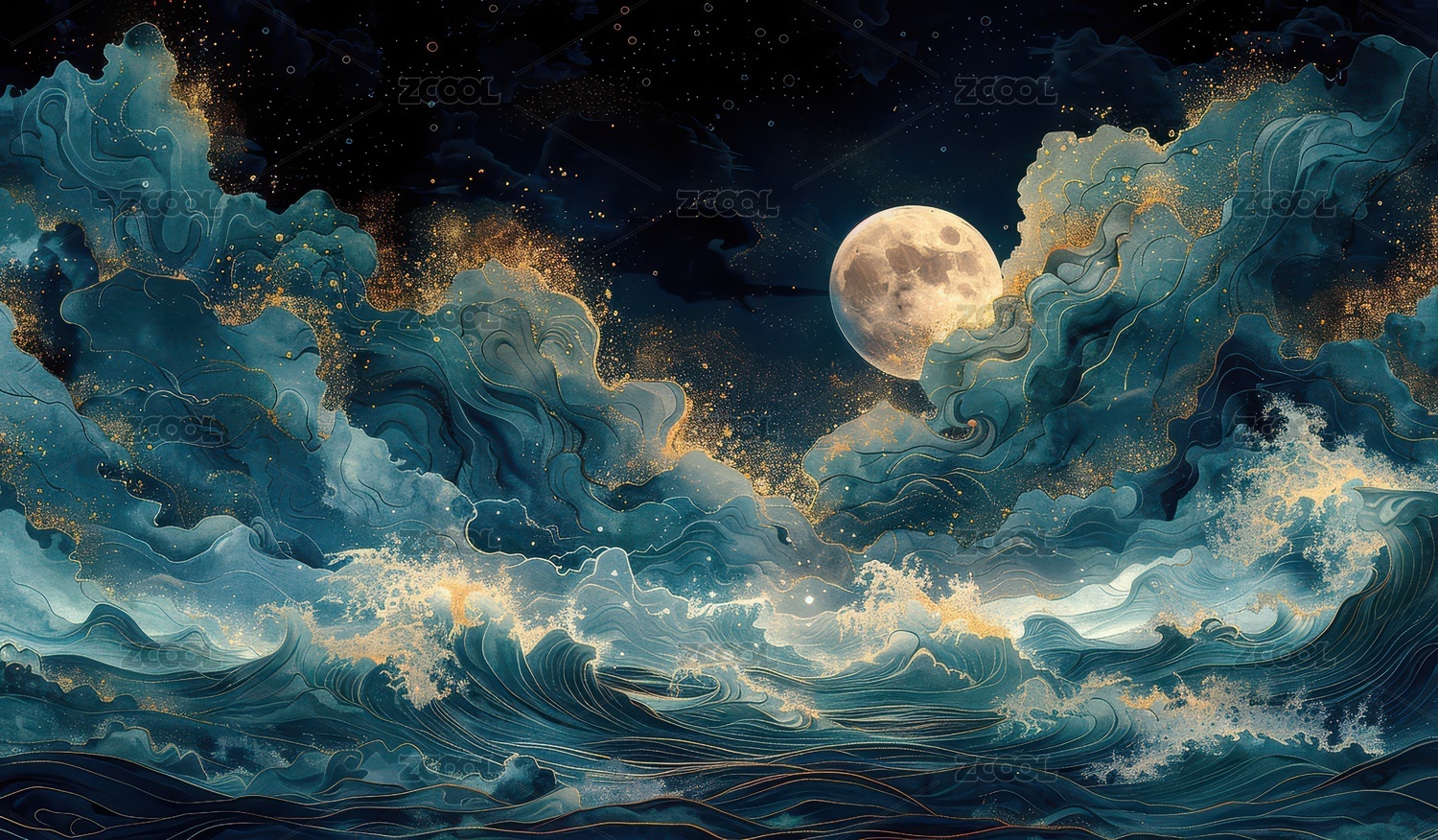 水墨风月夜海浪山峦图