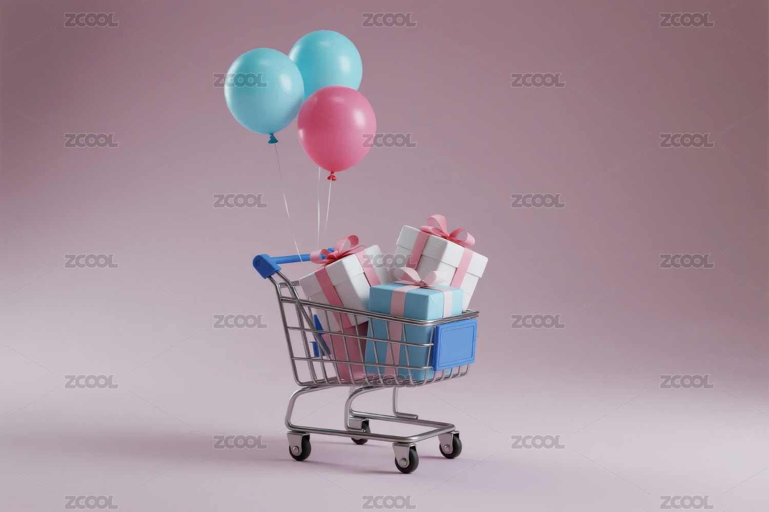 3D渲染可爱风购物车礼物和气球