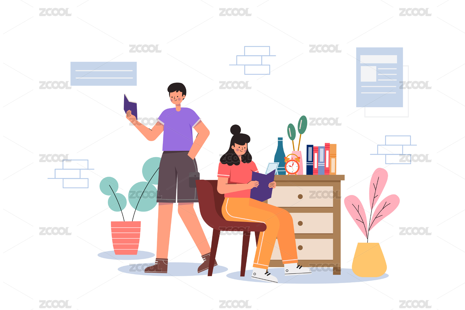正在读书的男孩女孩矢量插画
