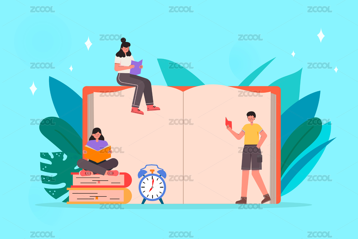 人物在打开的书本植物前的阅读学习矢量图