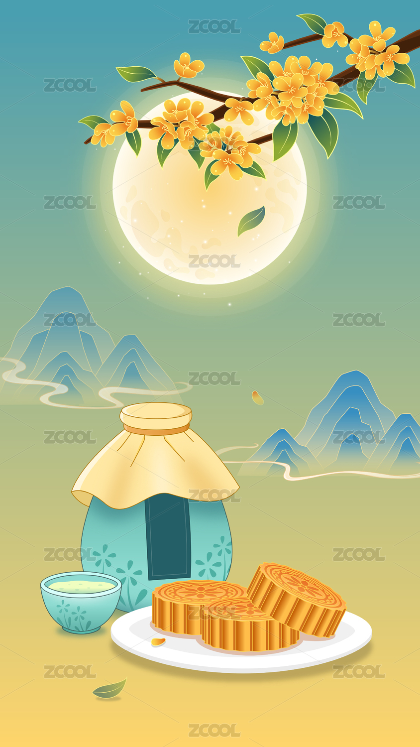 中秋节国潮风月饼桂花酒节日插画