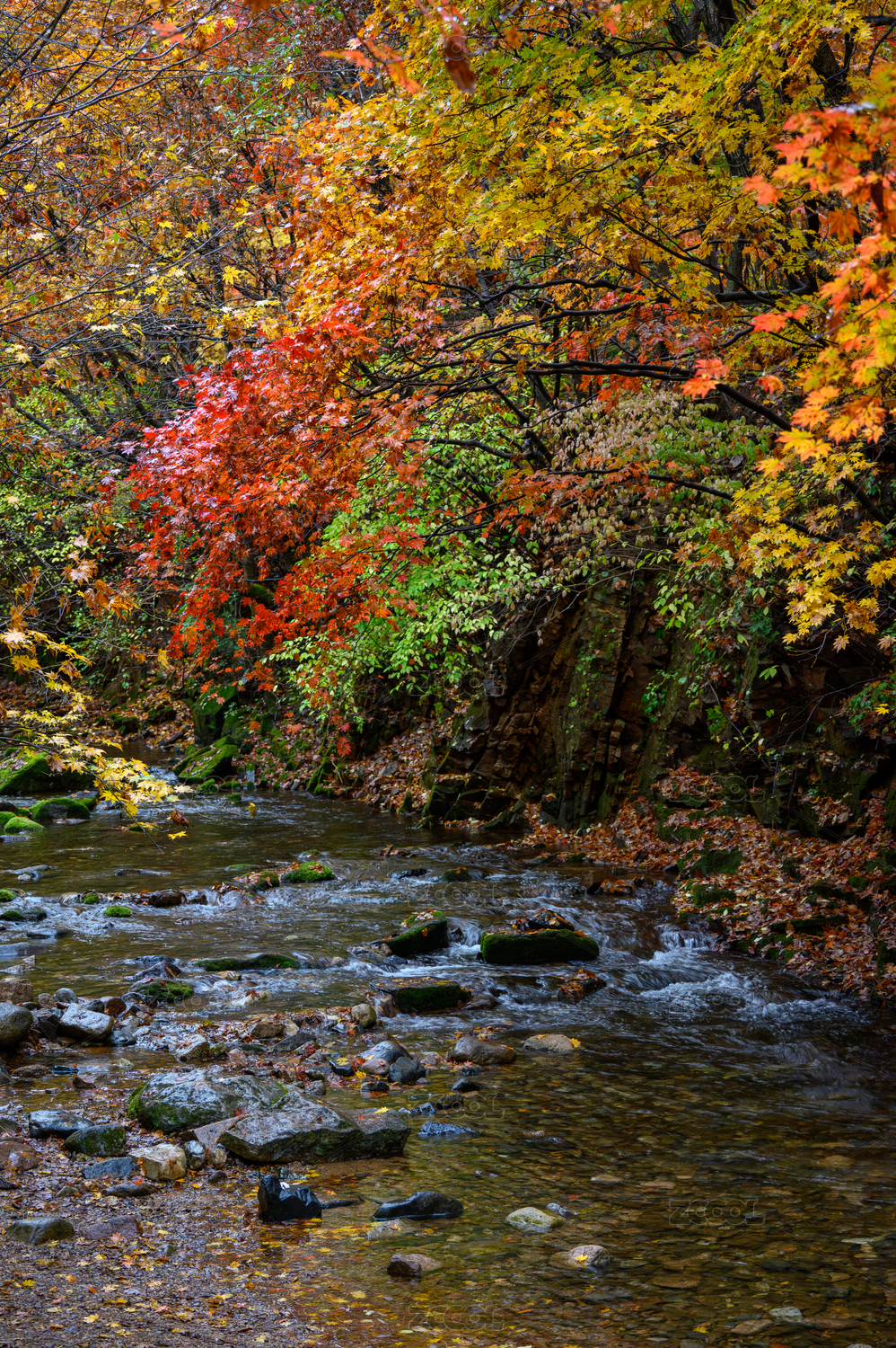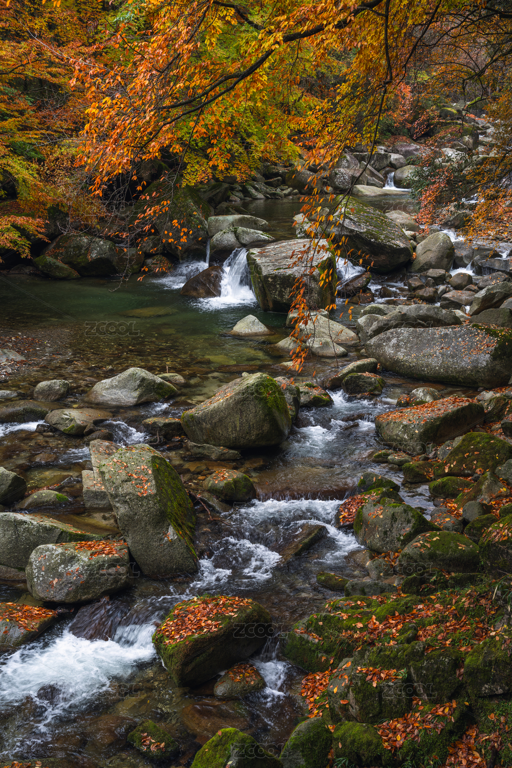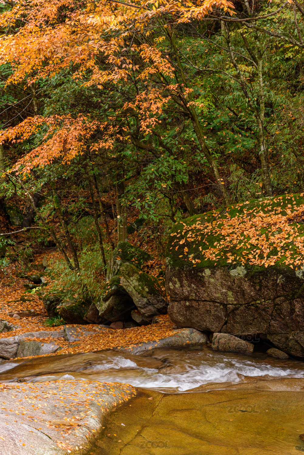 山涧美丽的红叶和落叶自然风光