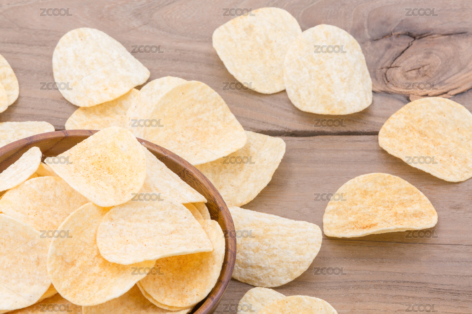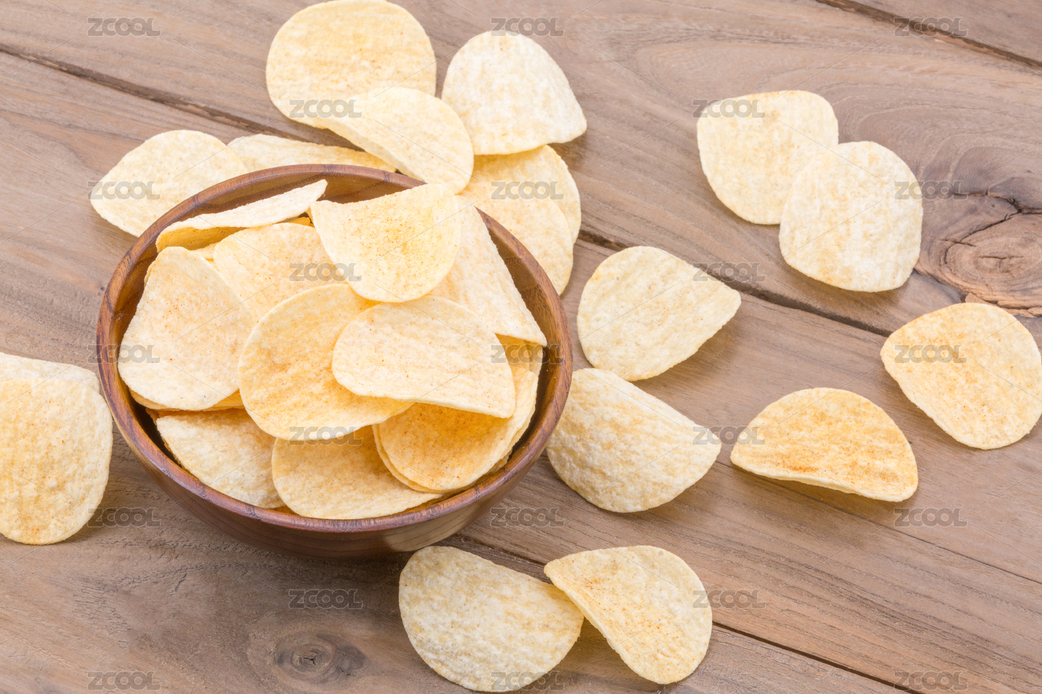 木桌上的炸薯片,美味的零食