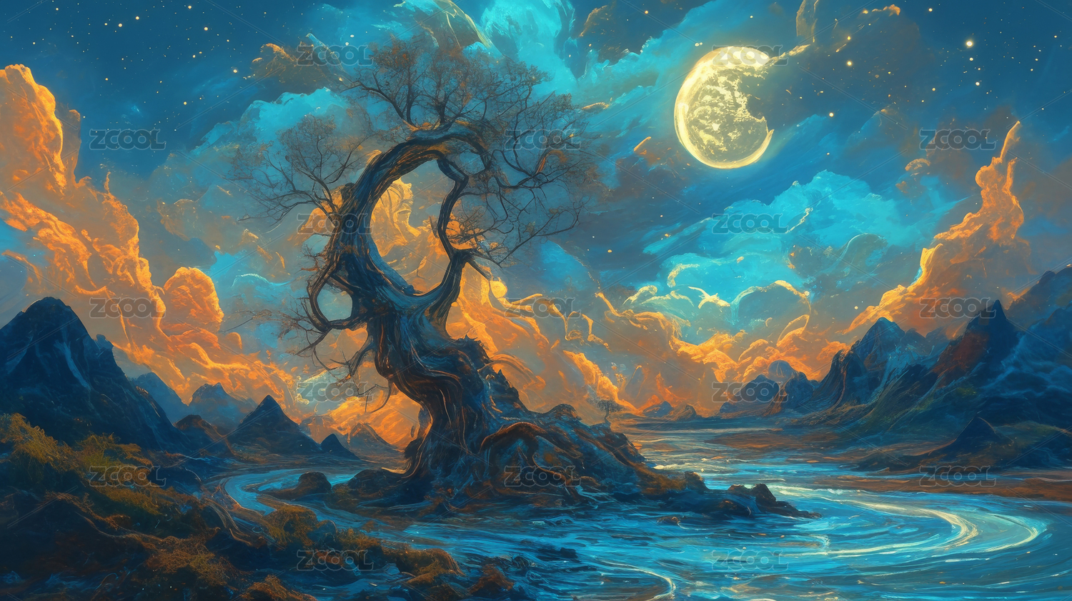 梦幻月夜下的古树