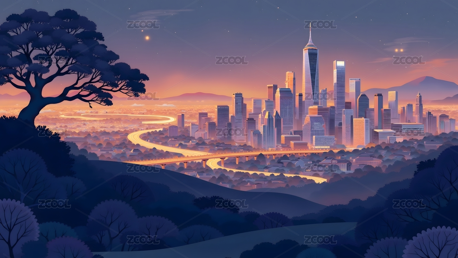 日落都市与森林的剪影