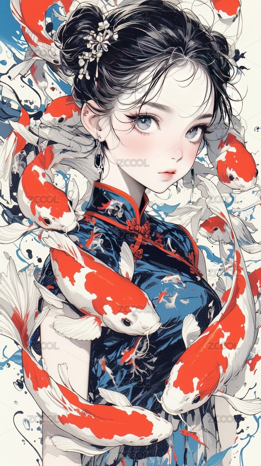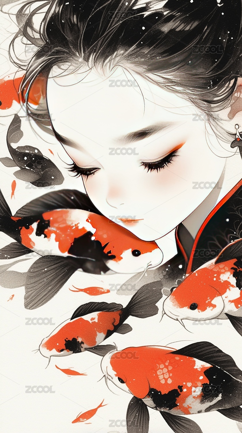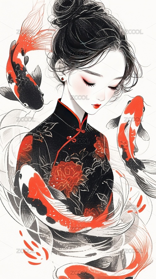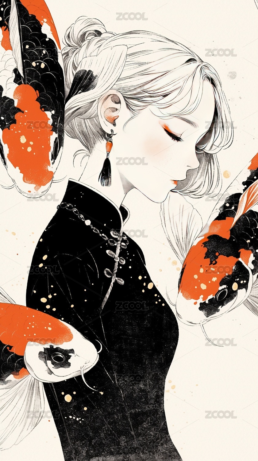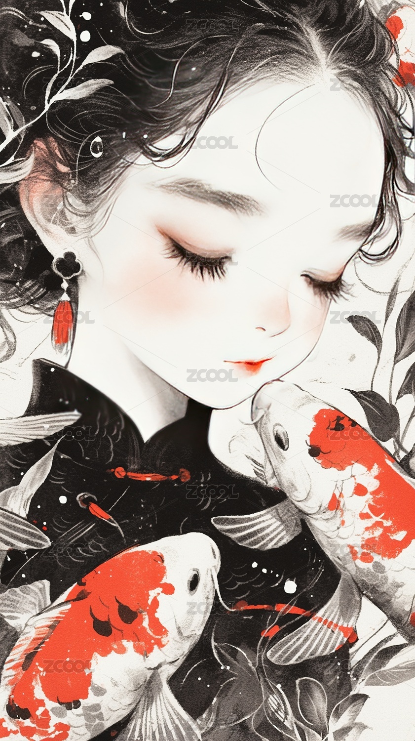 插画,女人,美女,中国文化,汉服,国风,历史服装,古代,肖像,鲤鱼