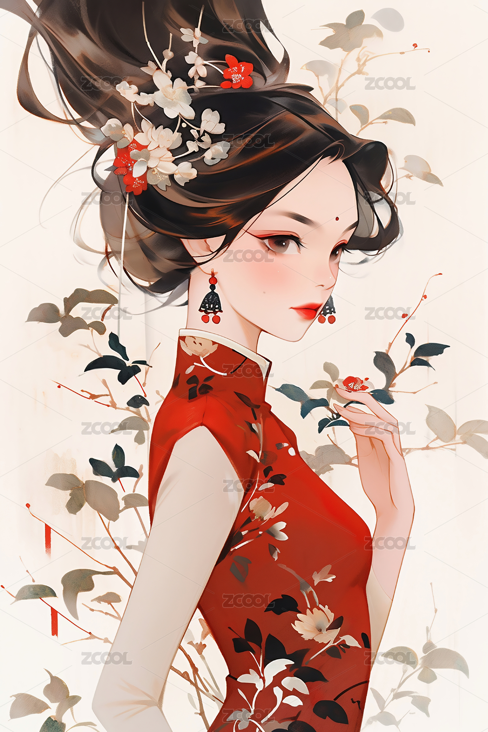 古风人像插画 戴美丽饰品的女人半身特写