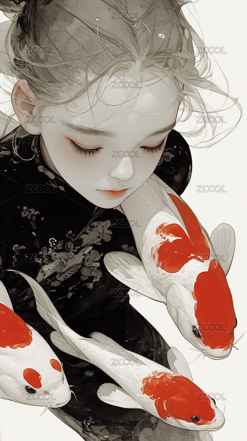被锦鲤围绕的女孩