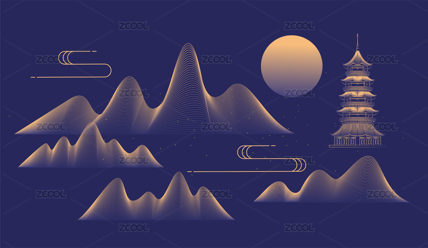 蓝色背景金色线条中国山水矢量插画