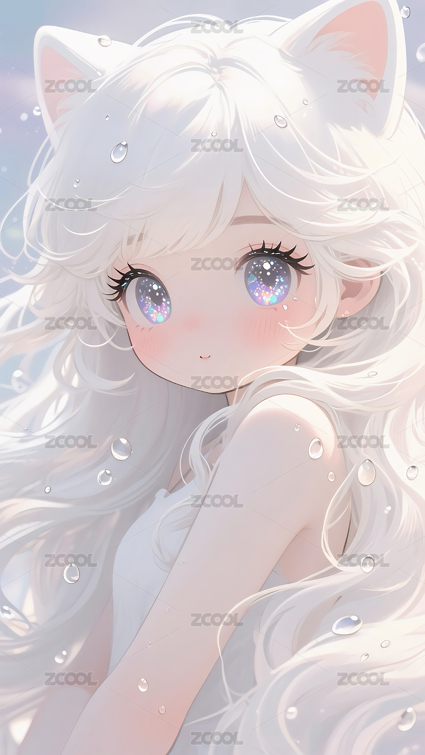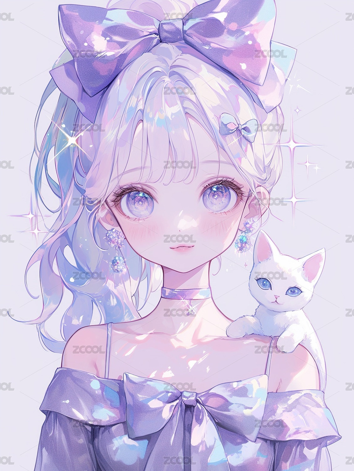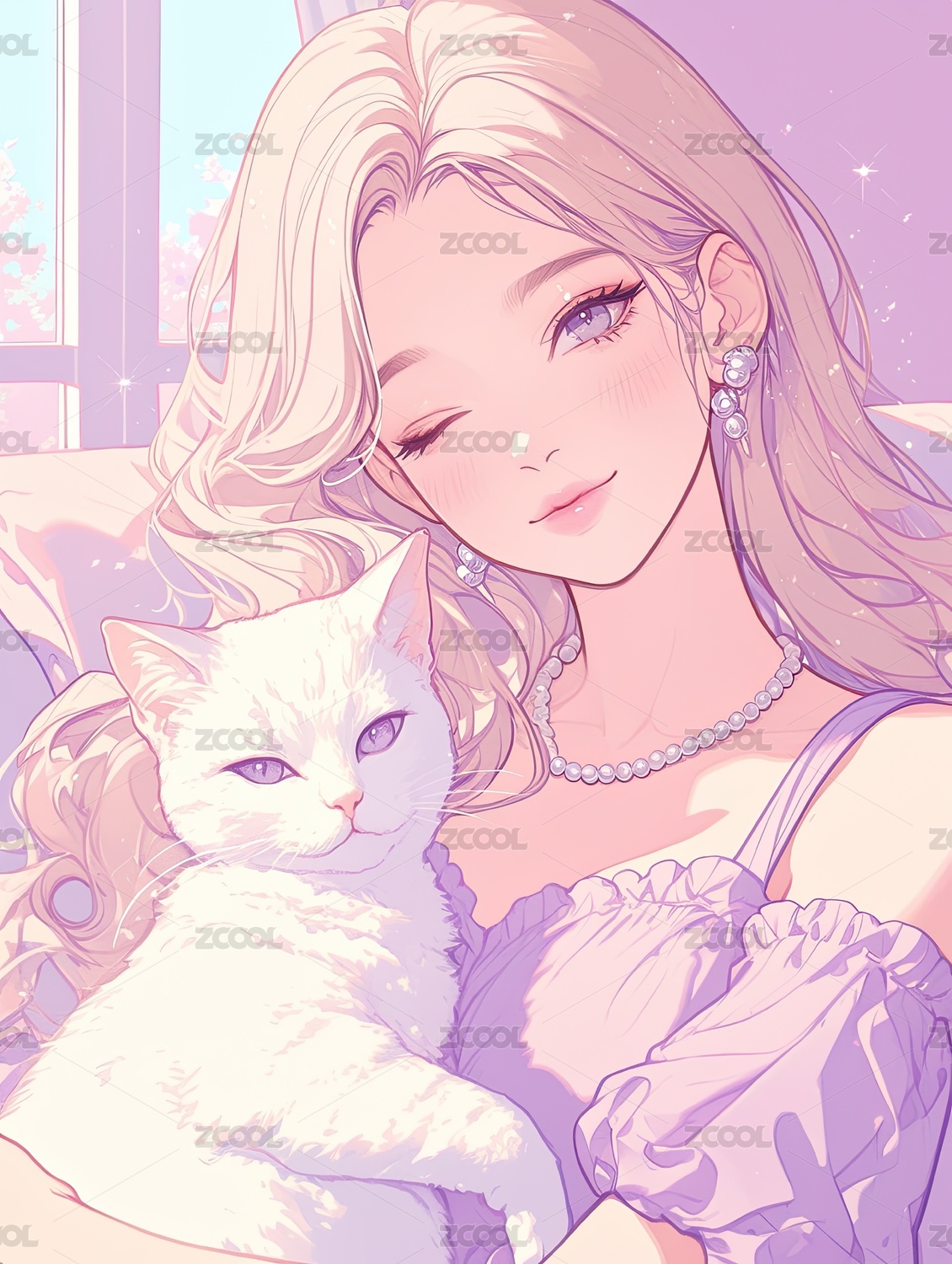 粉色,室内,温馨,治愈,猫,白猫,拥抱,卡通,女孩