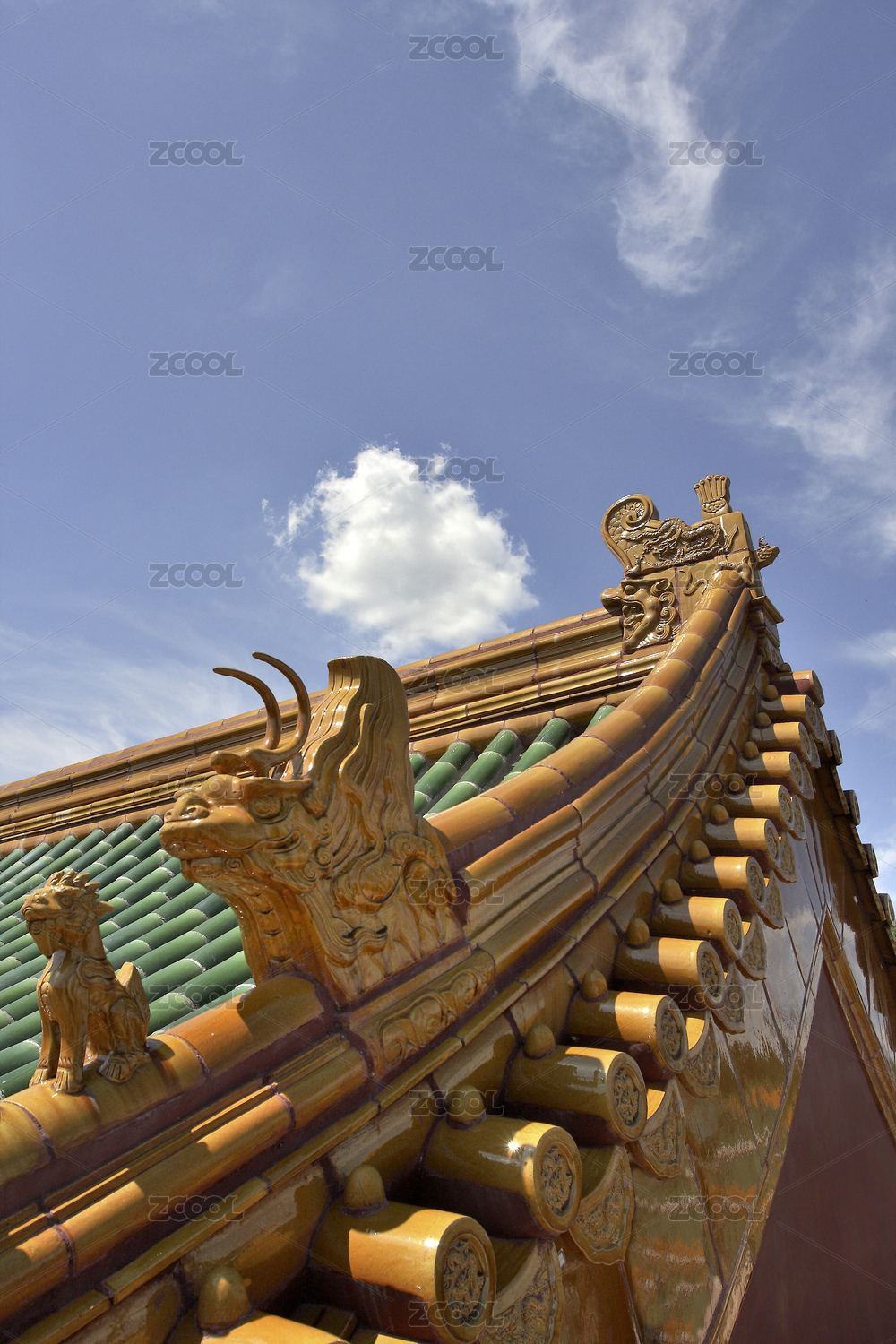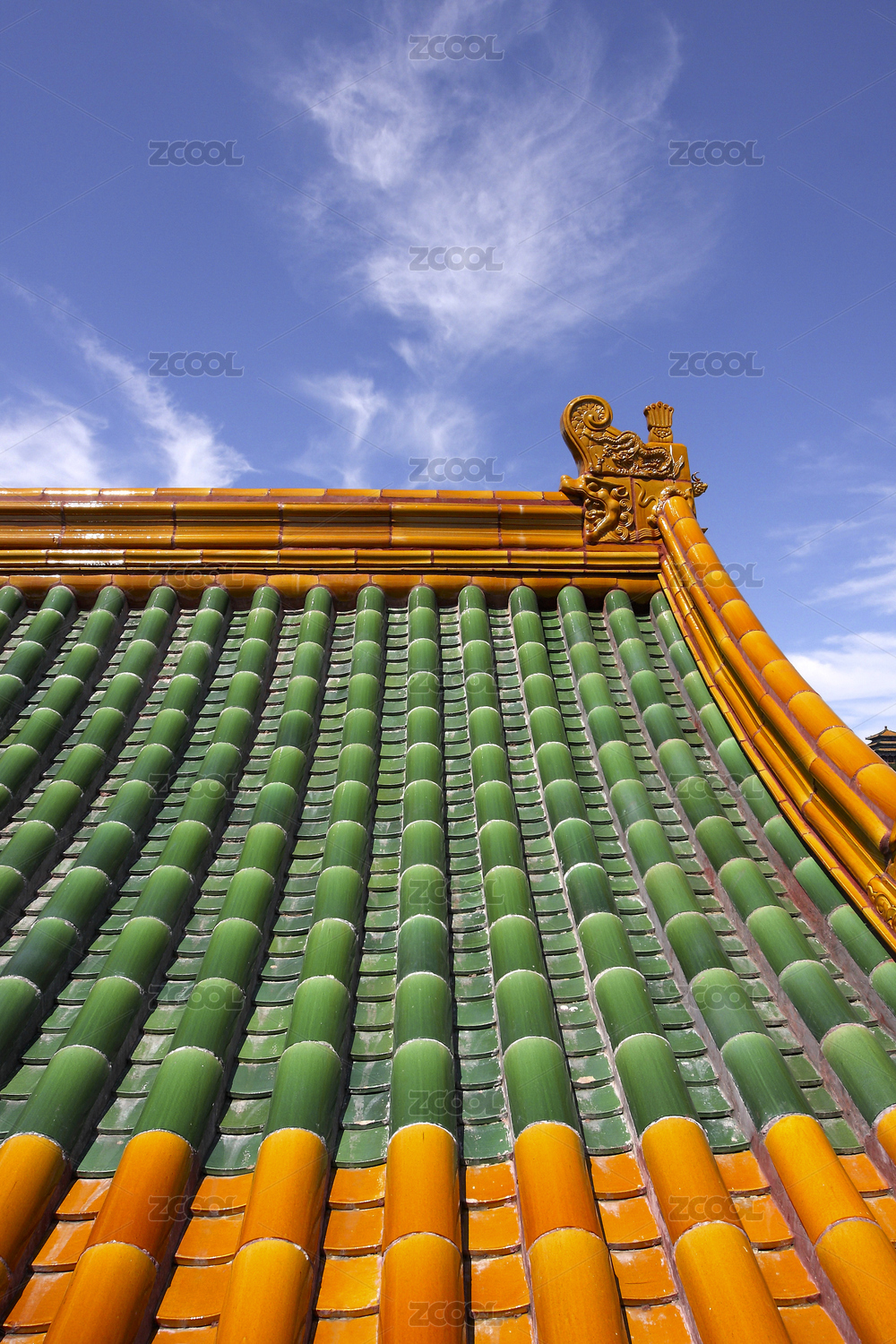 中国北京故宫宫殿屋顶上的垂兽与绿色黄色琉璃瓦