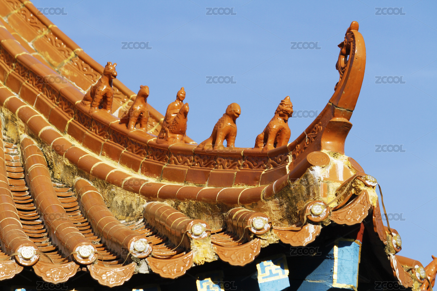 中国北故宫宫殿屋顶上的走兽与绿色黄色琉璃瓦