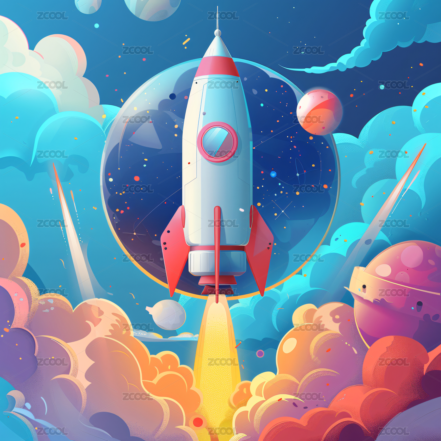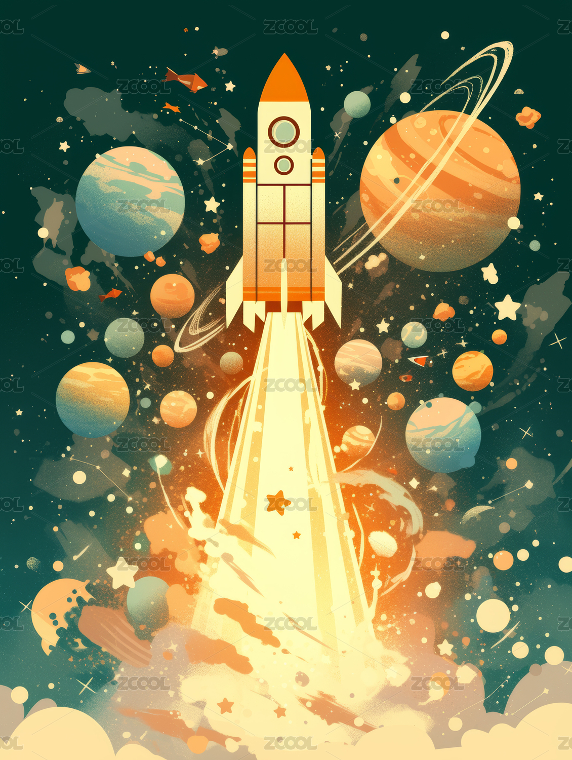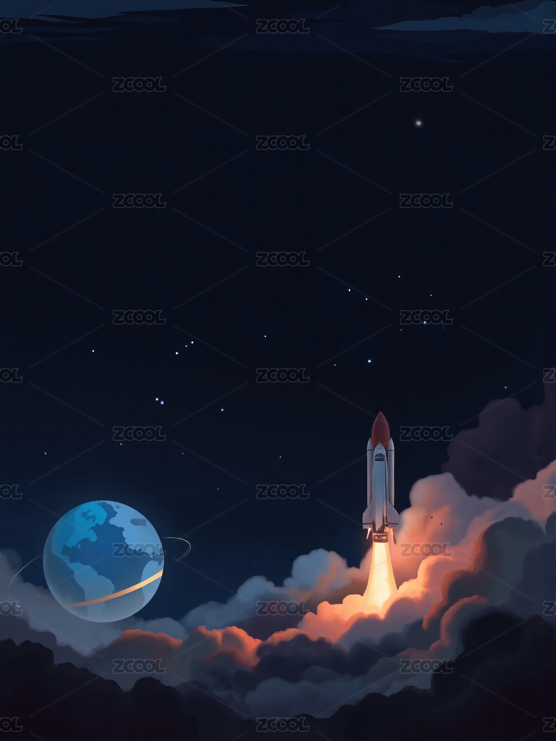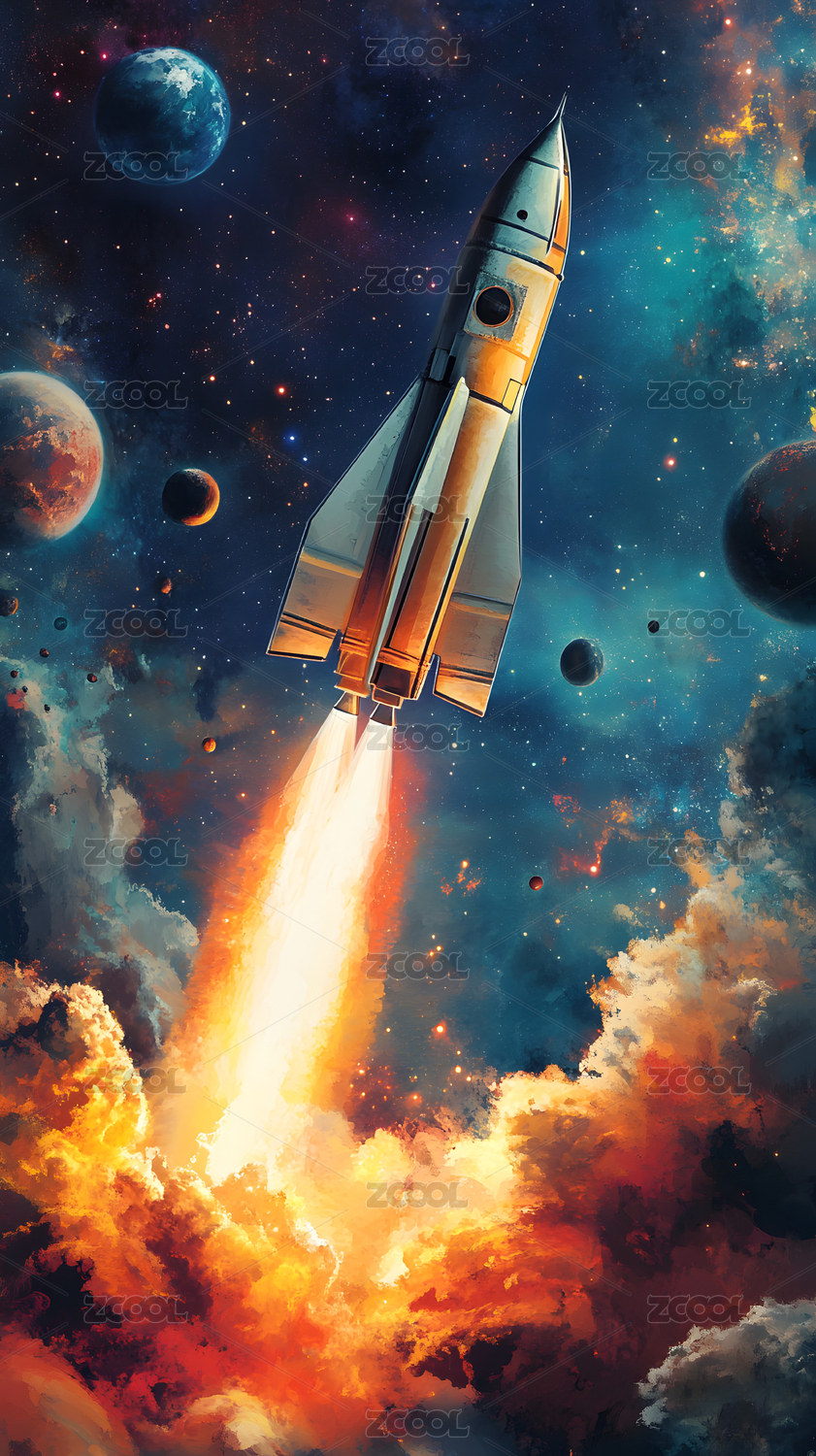 发射中的火箭与行星插画