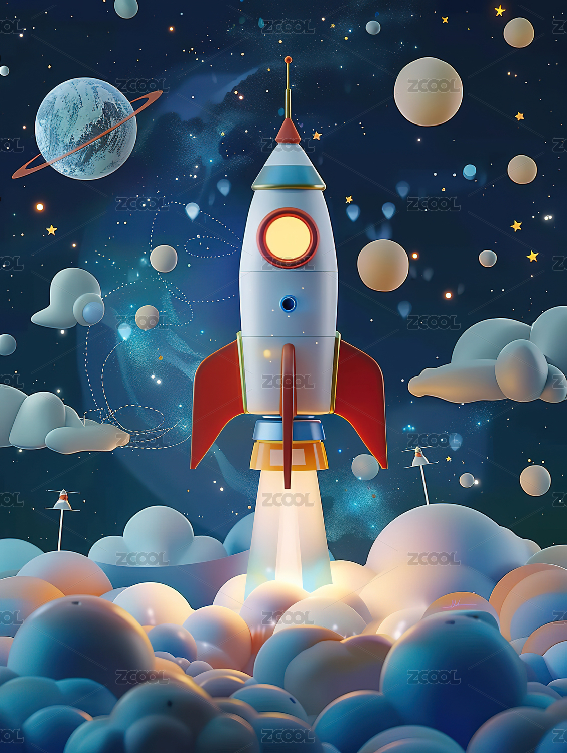 3D卡通火箭飞向太空创意场景