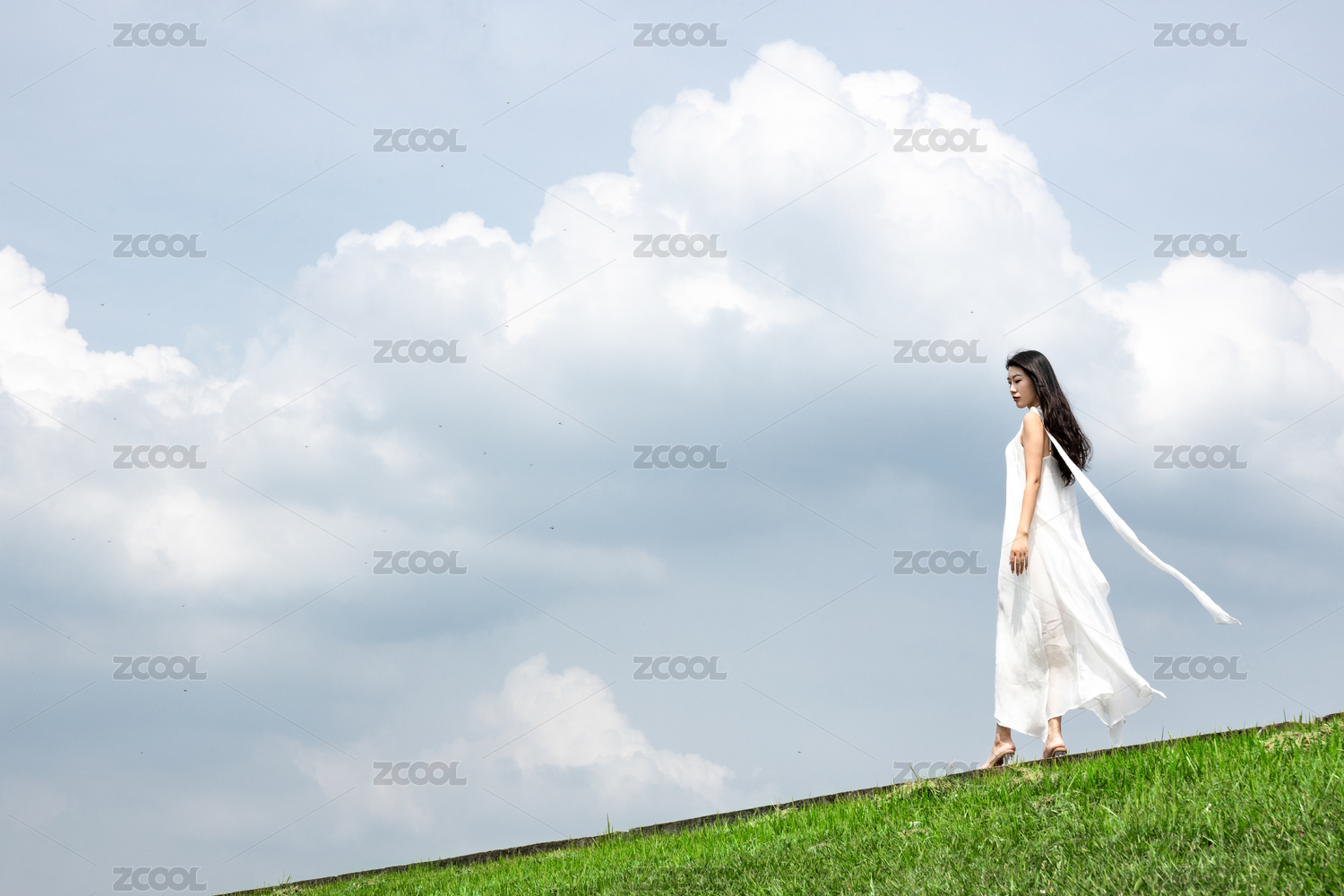 年轻漂亮的亚洲女人户外与白色礼服草甸