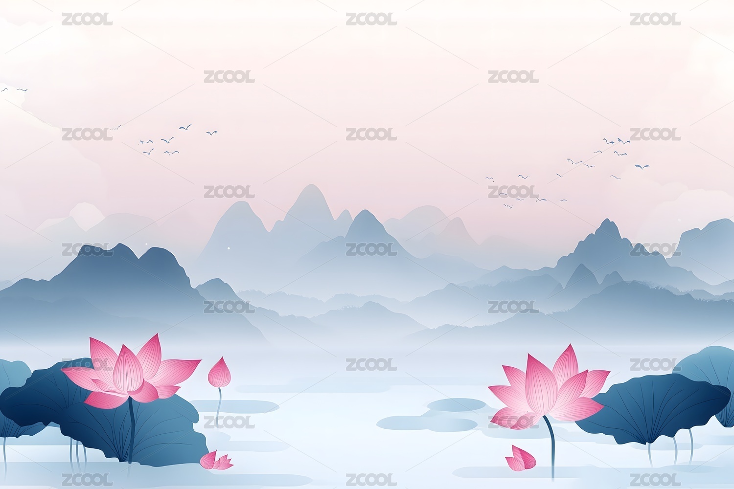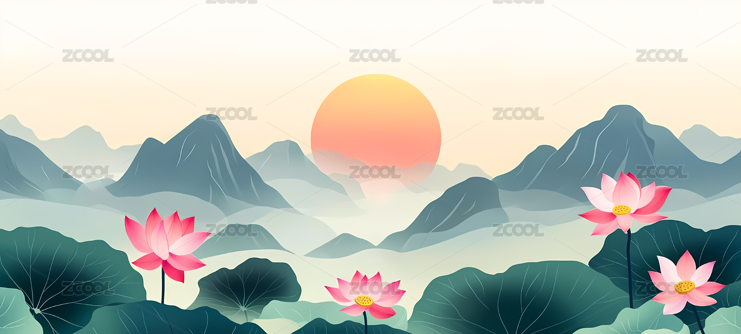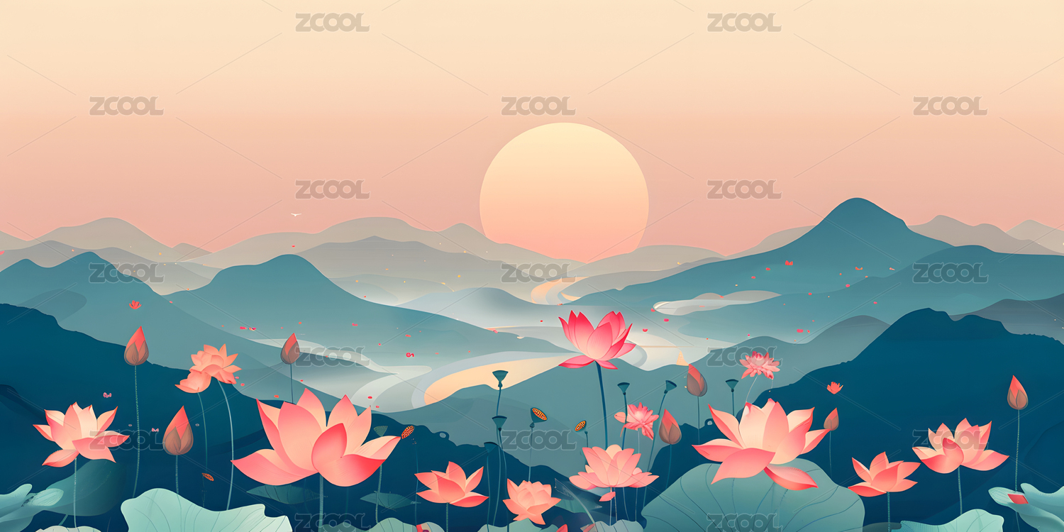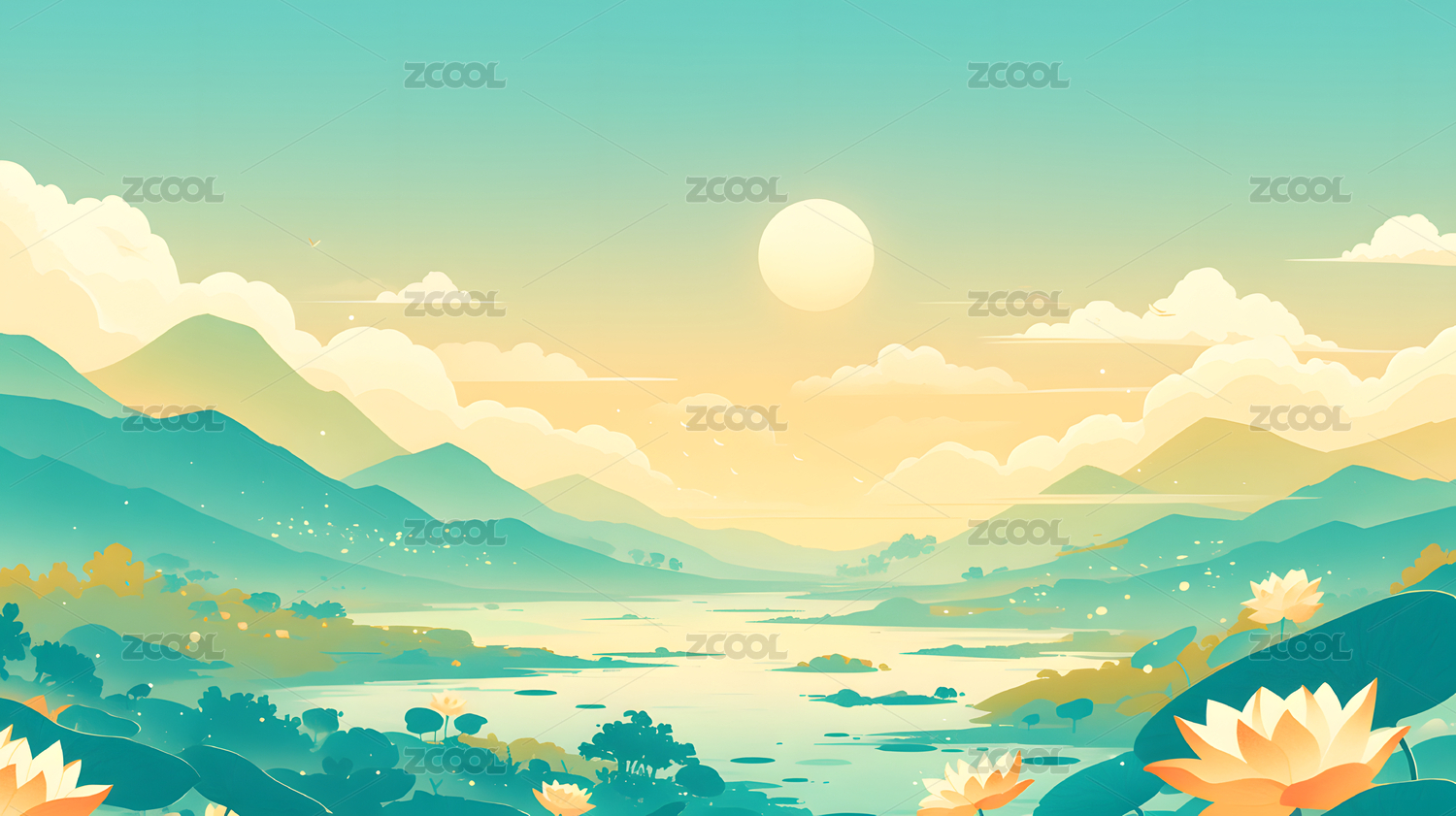 中秋节国潮插画天空中大月亮群山环抱荷塘