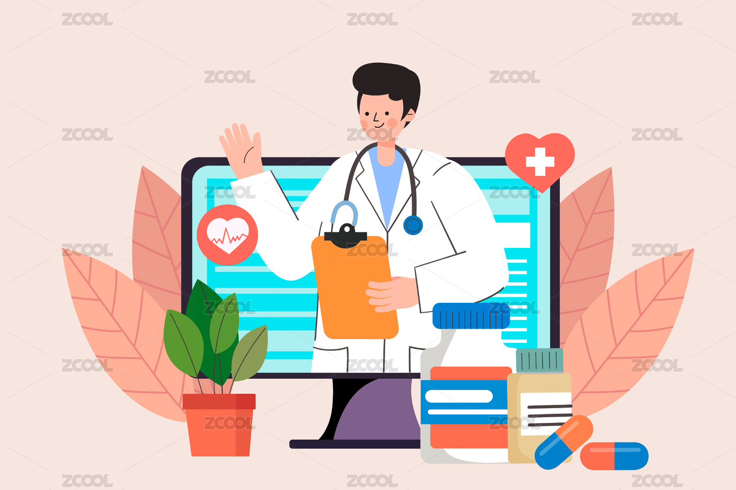 互联网医疗线上看诊手机挂号健康体检插画