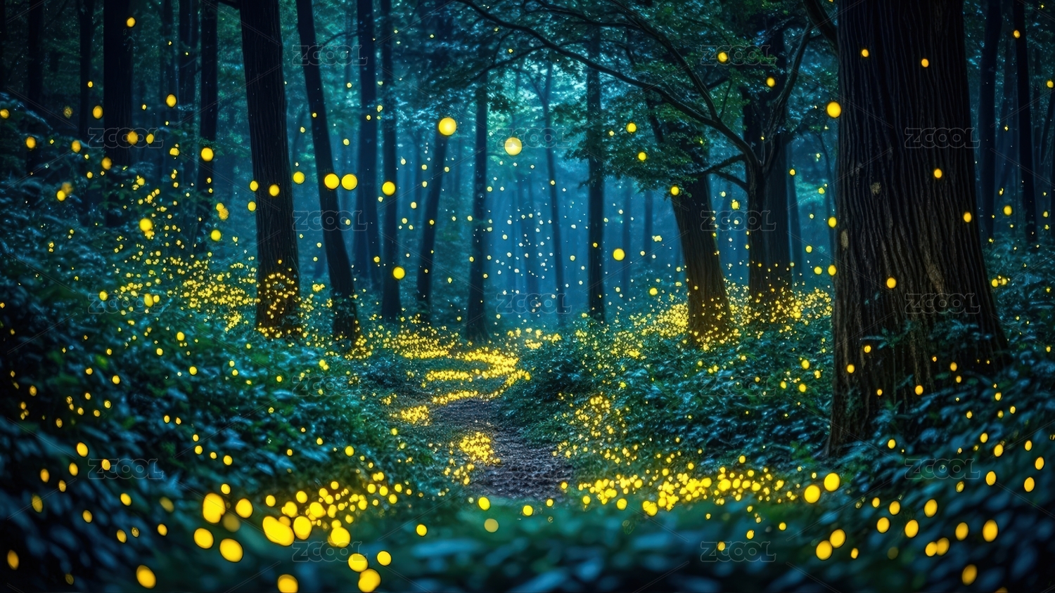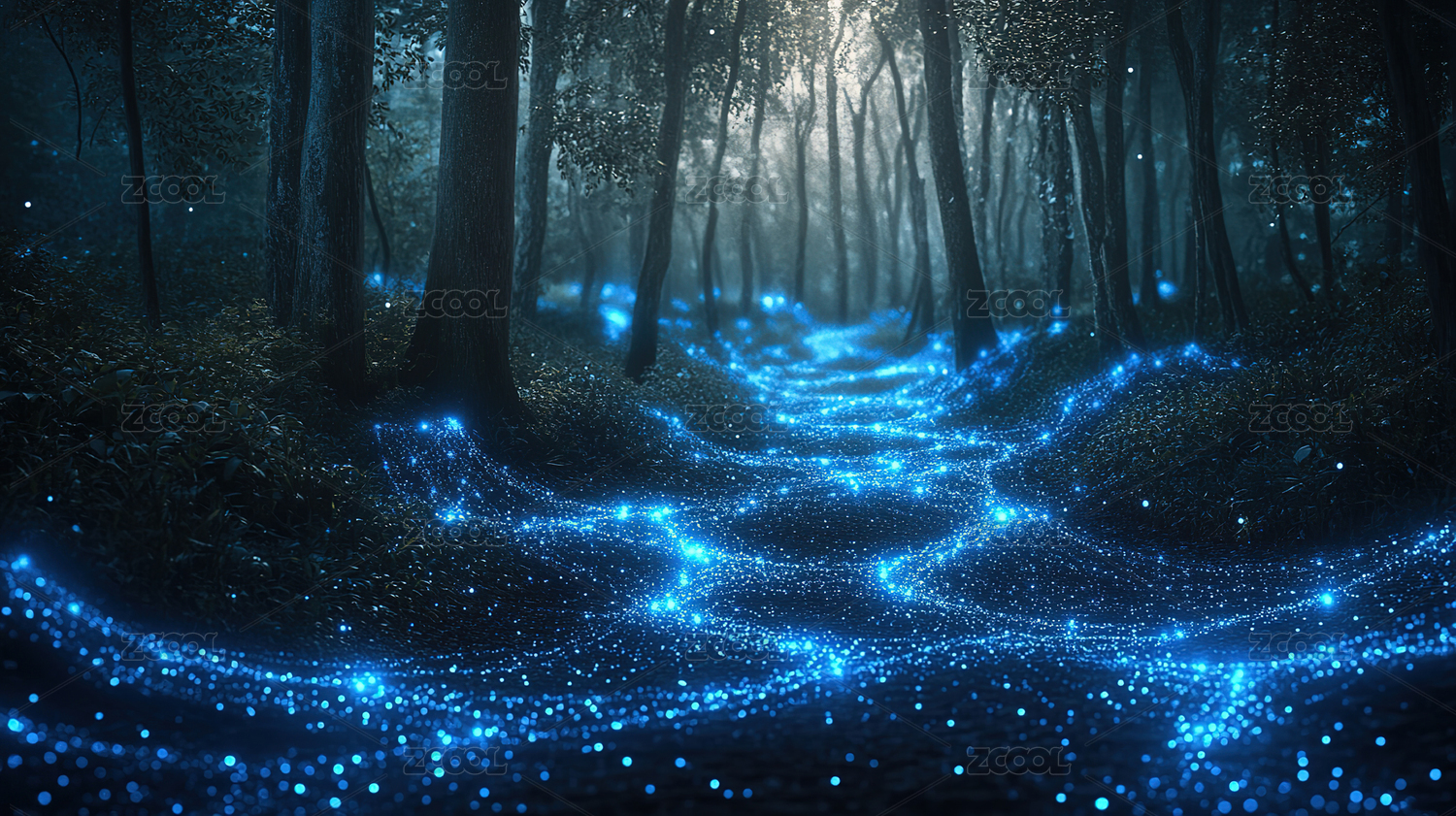 幽暗森林中蓝色光点闪烁的神秘道路