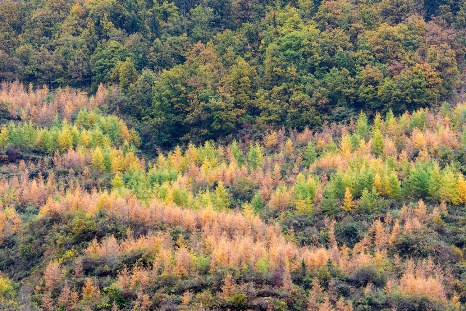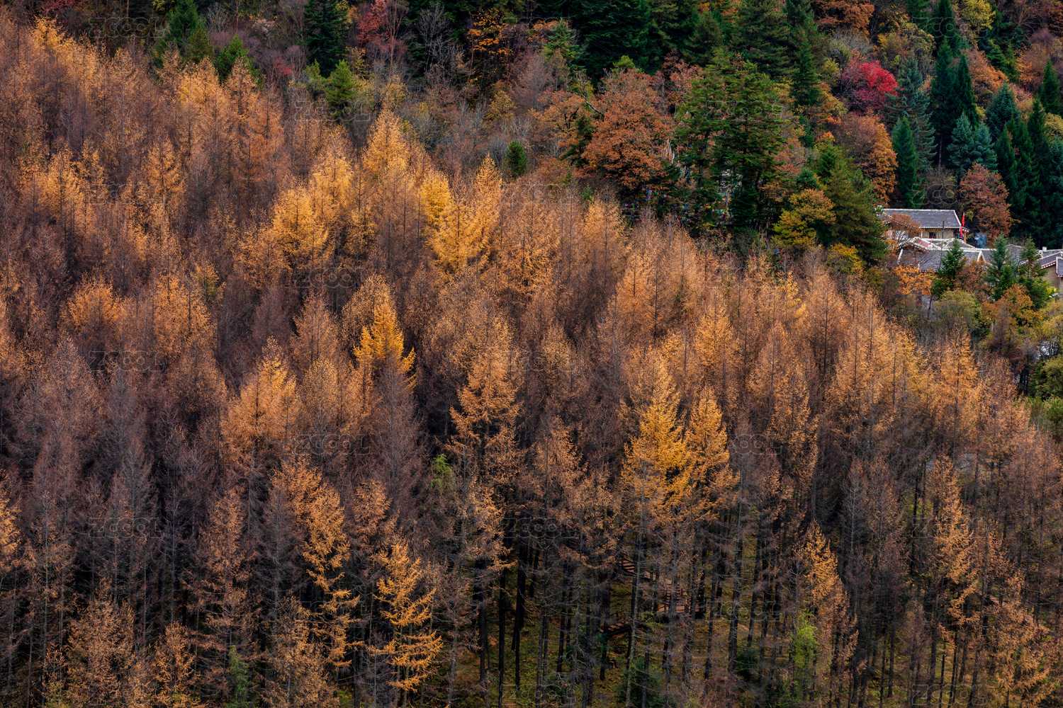 中国四川汶川松林湾秋天落叶松彩林