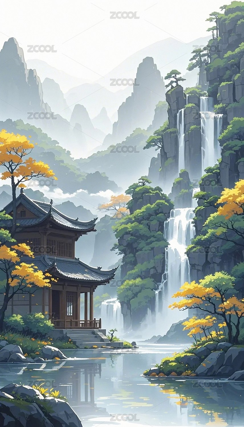 AIGC202407,仙境,山水,山峰,悬崖,峭壁,瀑布,古建筑,亭子,楼阁