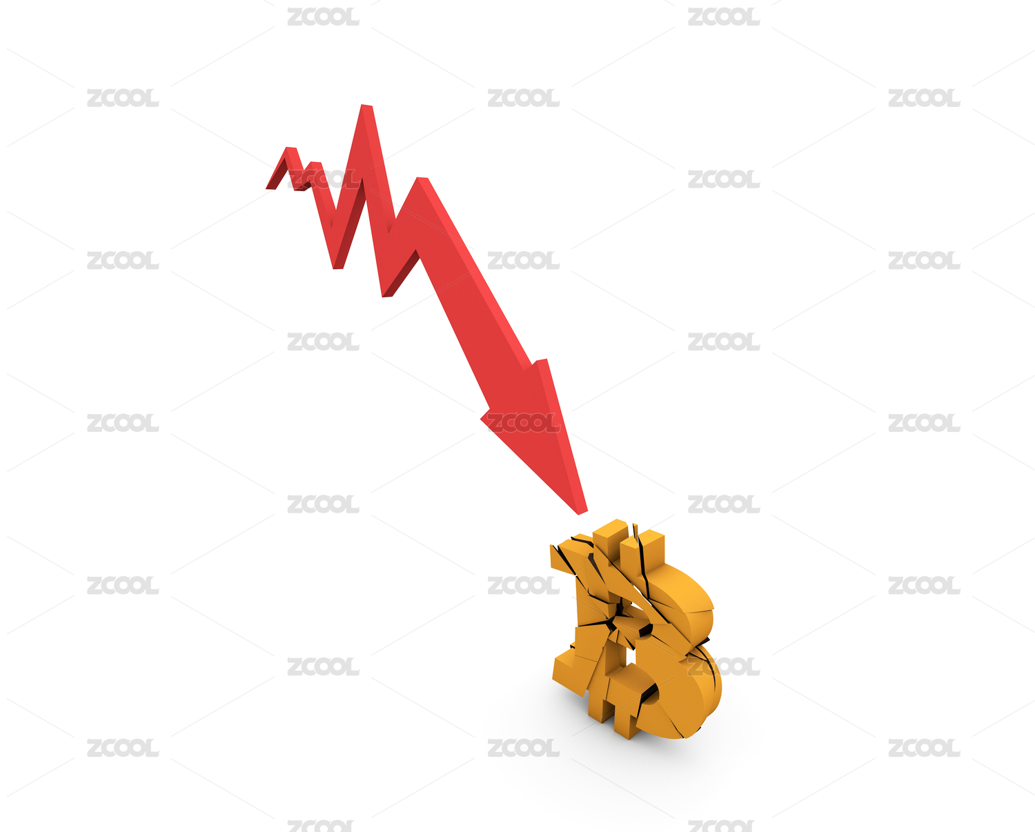 下降的红色箭头与货币符号裂痕,经济衰落,美元符号
