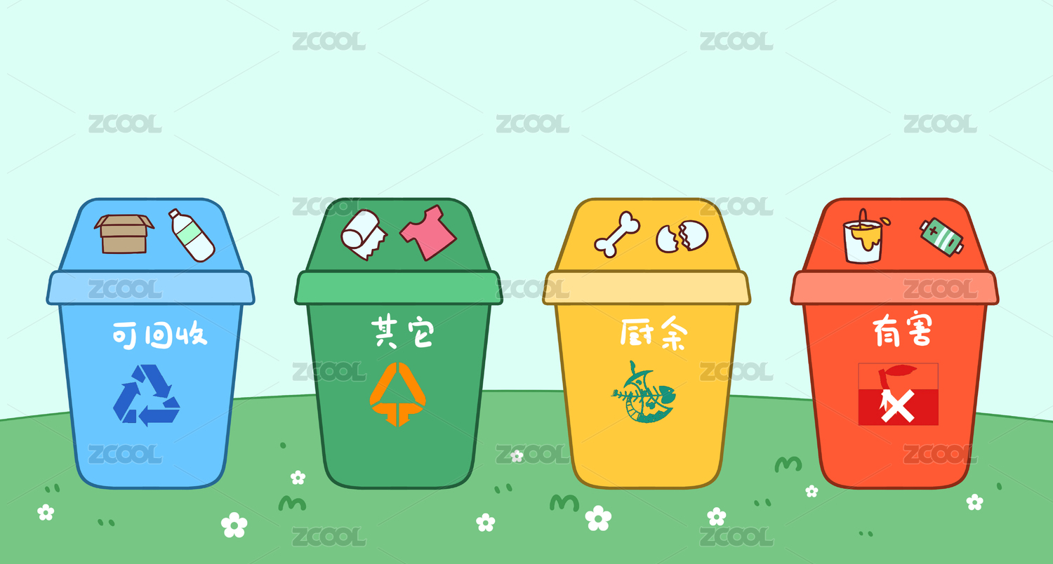 住宅小区里路边的垃圾箱 小清新垃圾分类环保插画背景