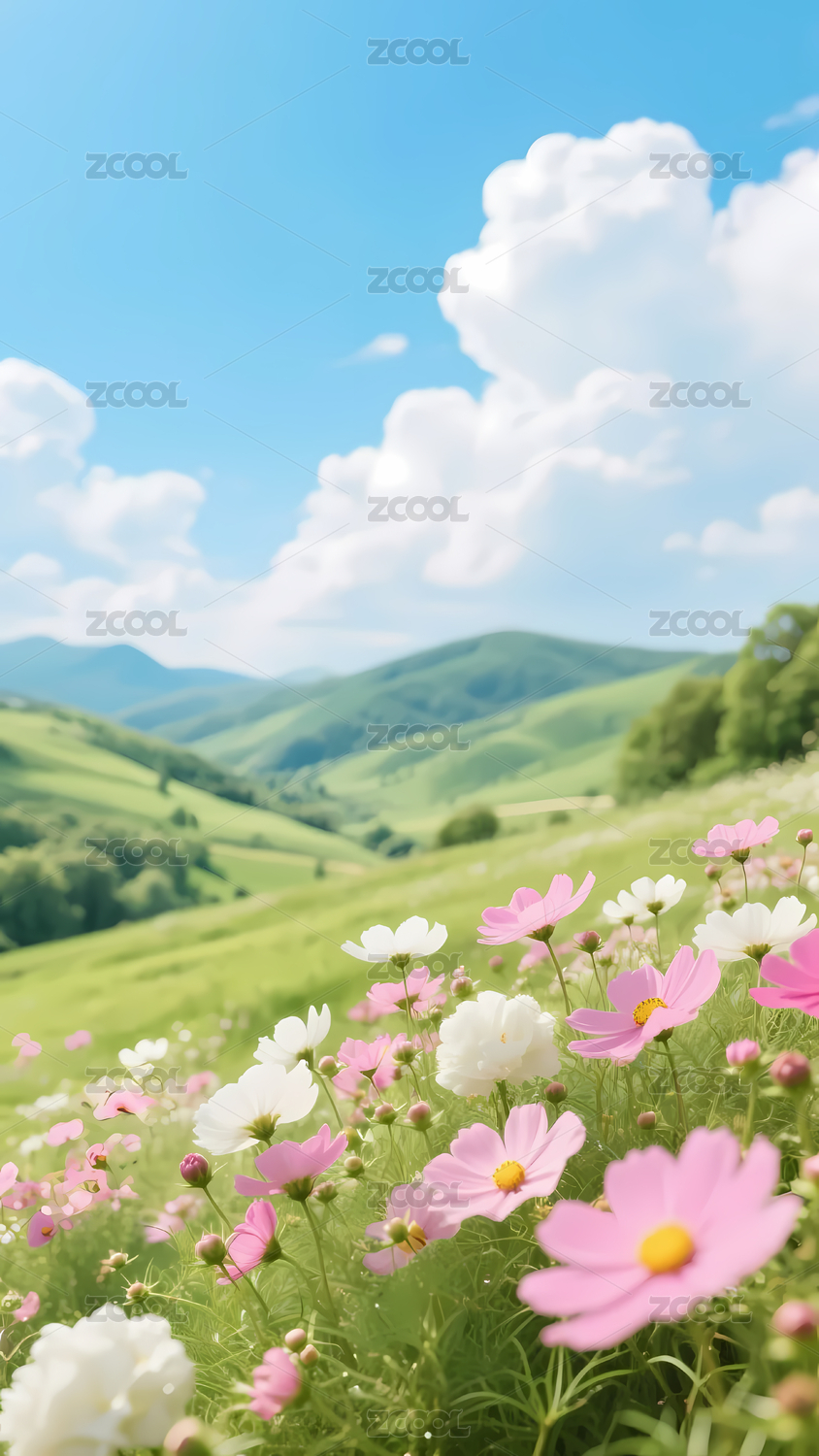 春天鲜花草地蓝天白云田园风光清新卡通背景