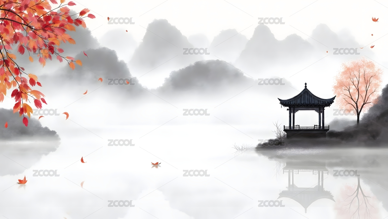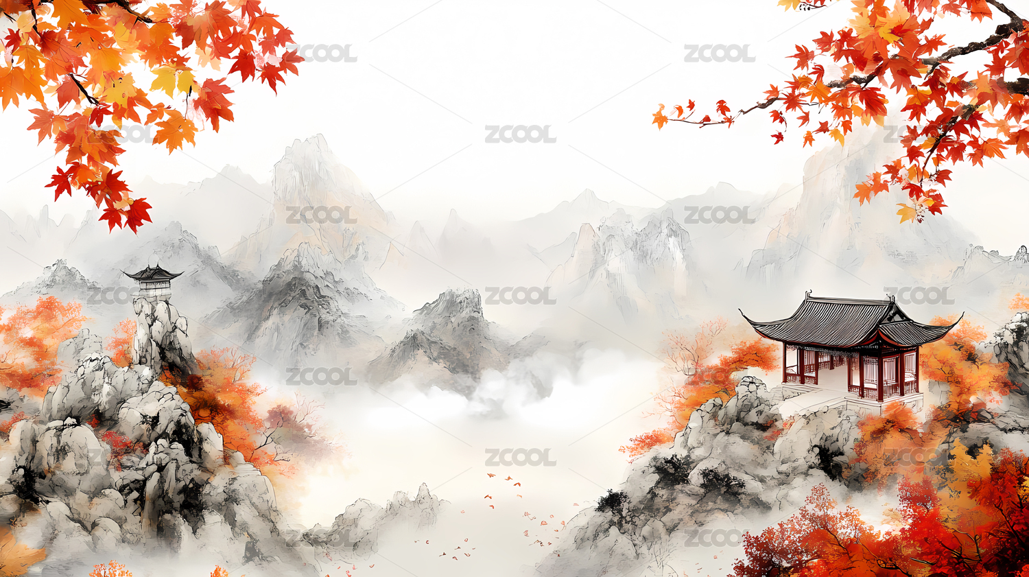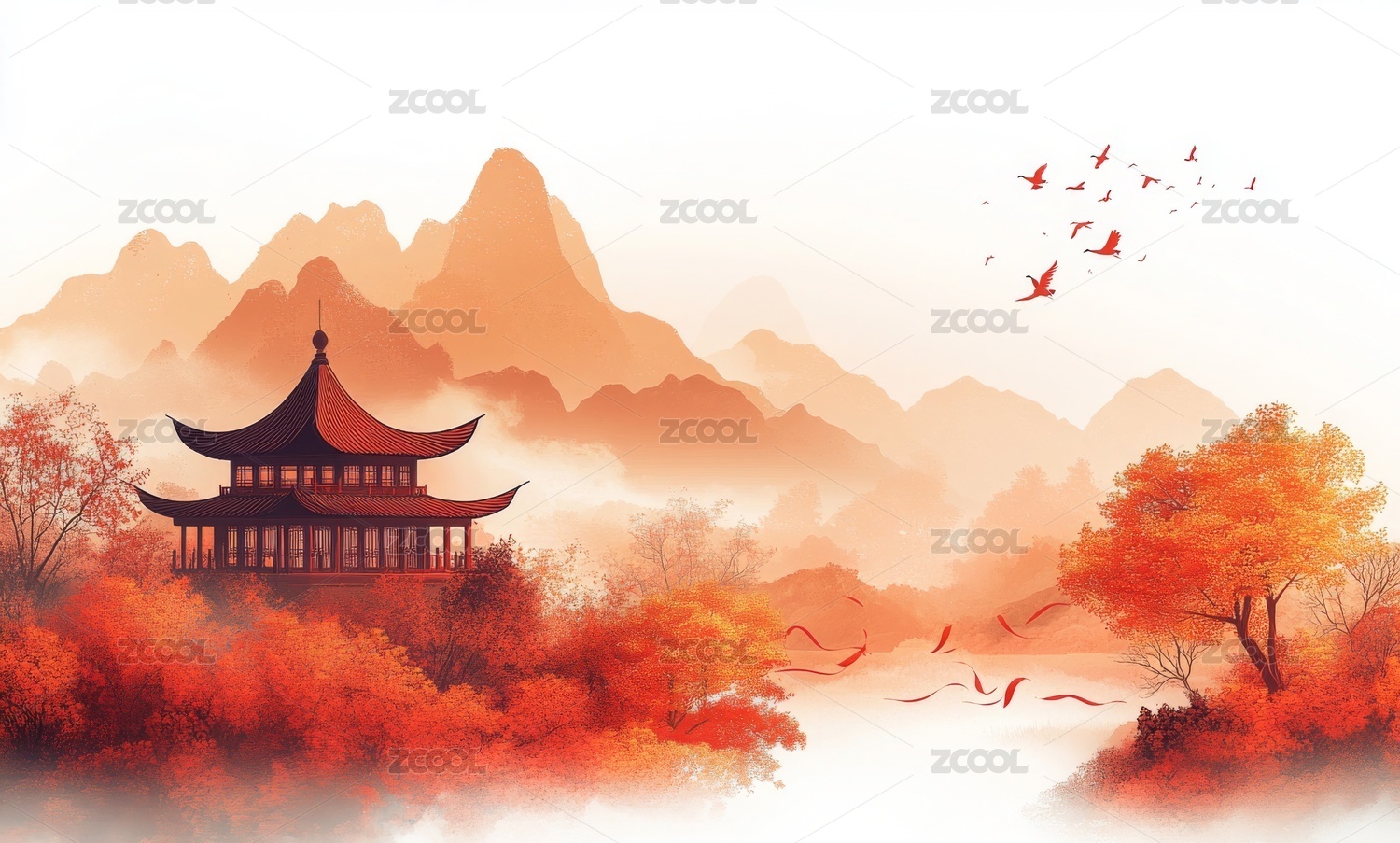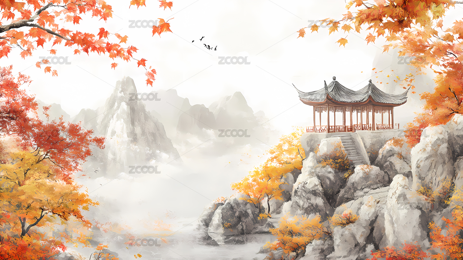 中国风秋天插画建筑凉亭暖色风景壁纸