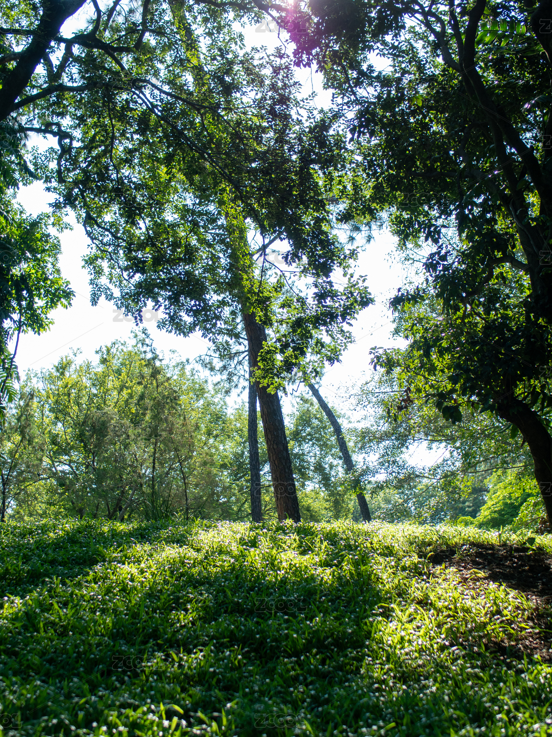 树林,夏天,树木,树,茂林,公园,阳光,晴天,草地,低视角
