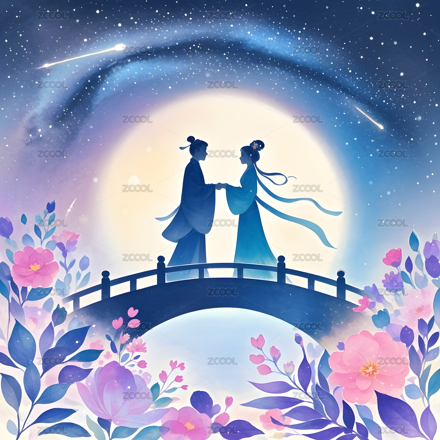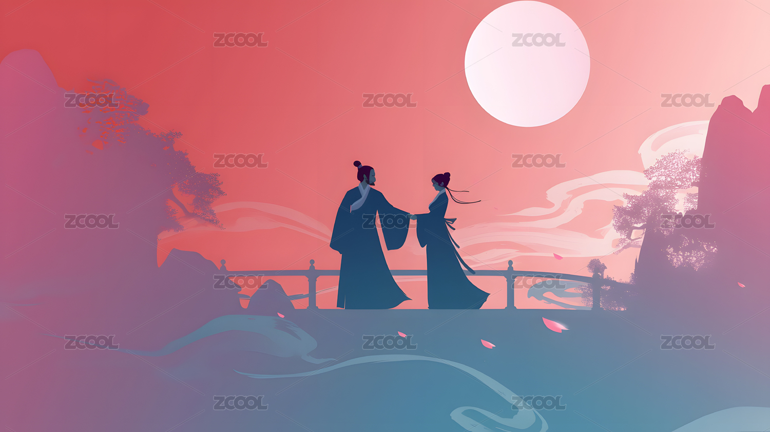 中国风七夕节在桥梁上牵手赏月的牛郎织女