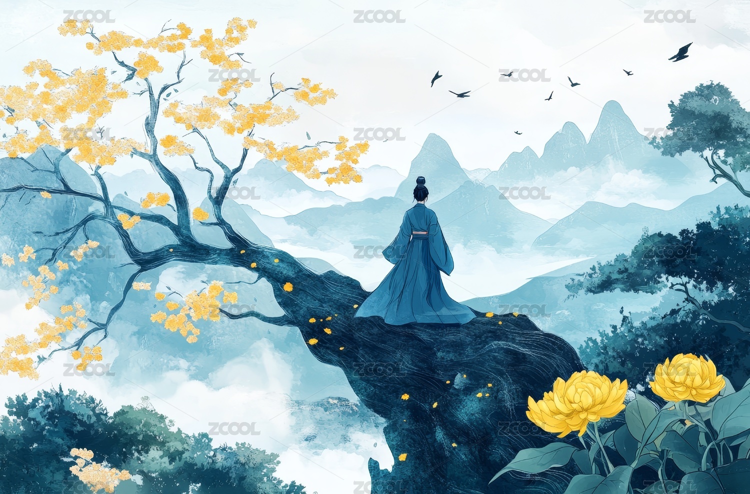 AIGC202406,重阳节,秋天,秋色,赏秋,菊花,插画