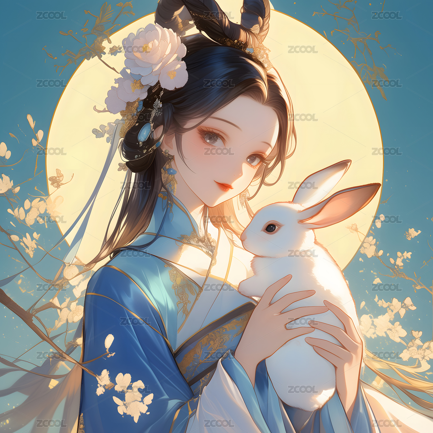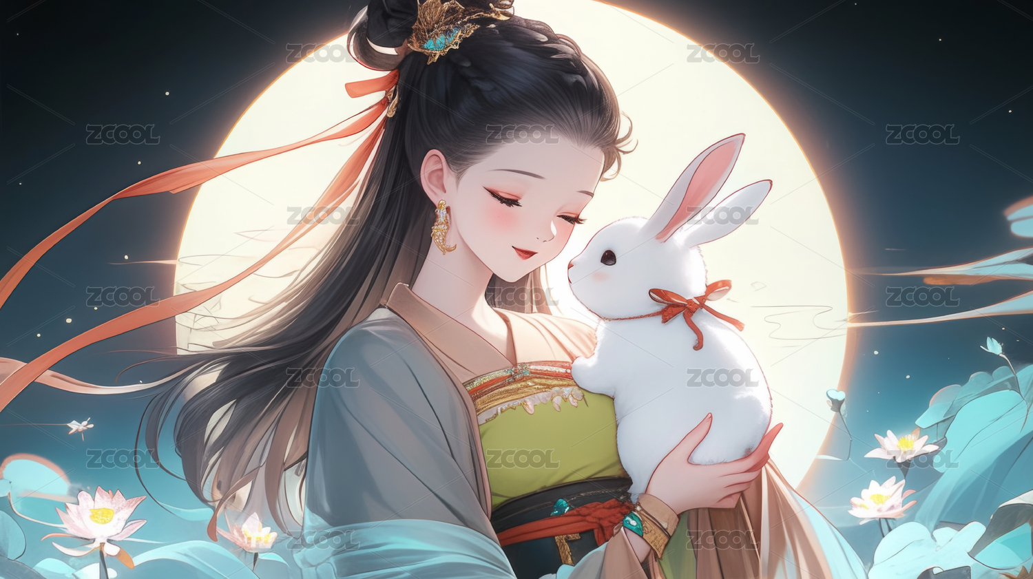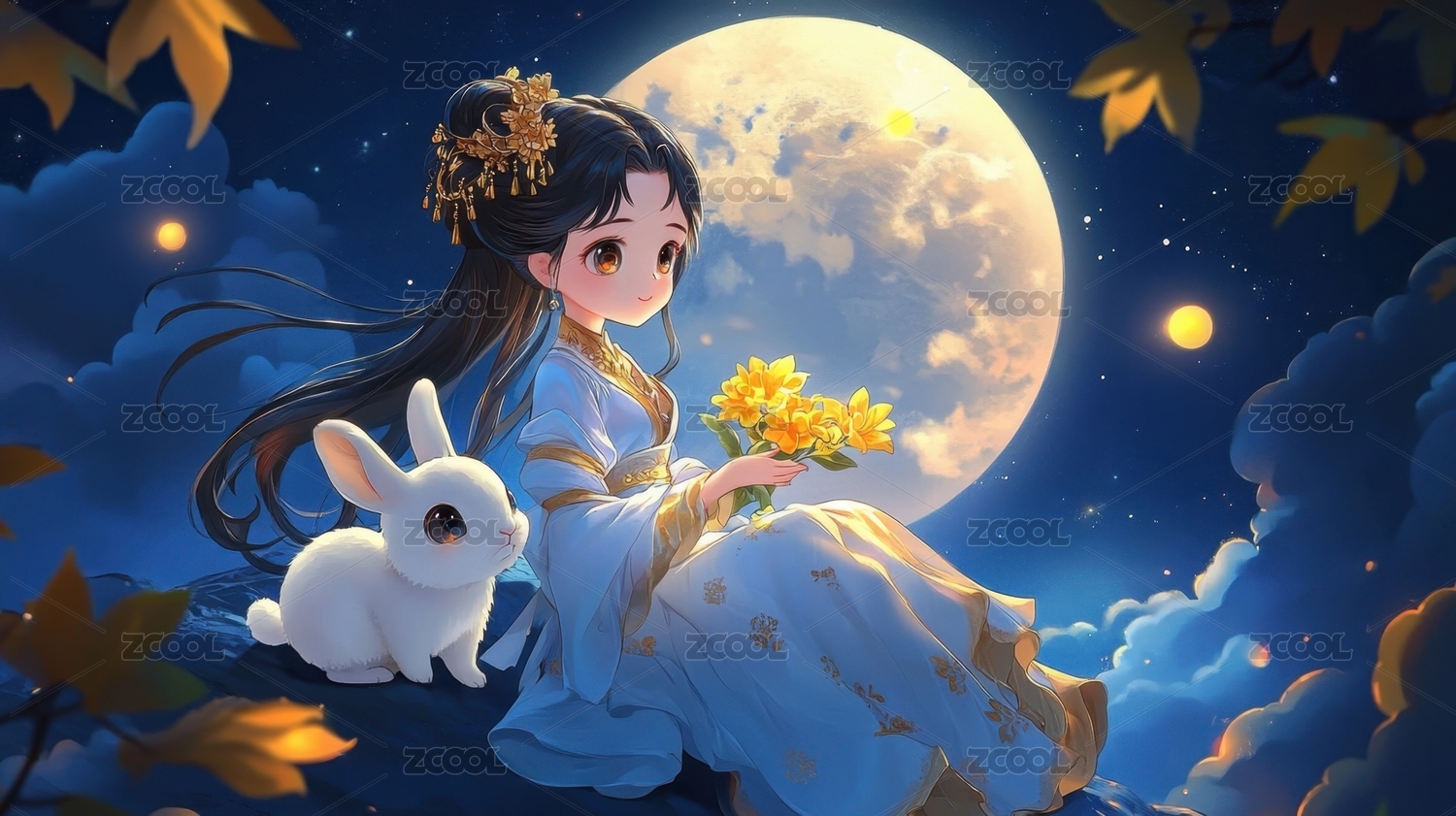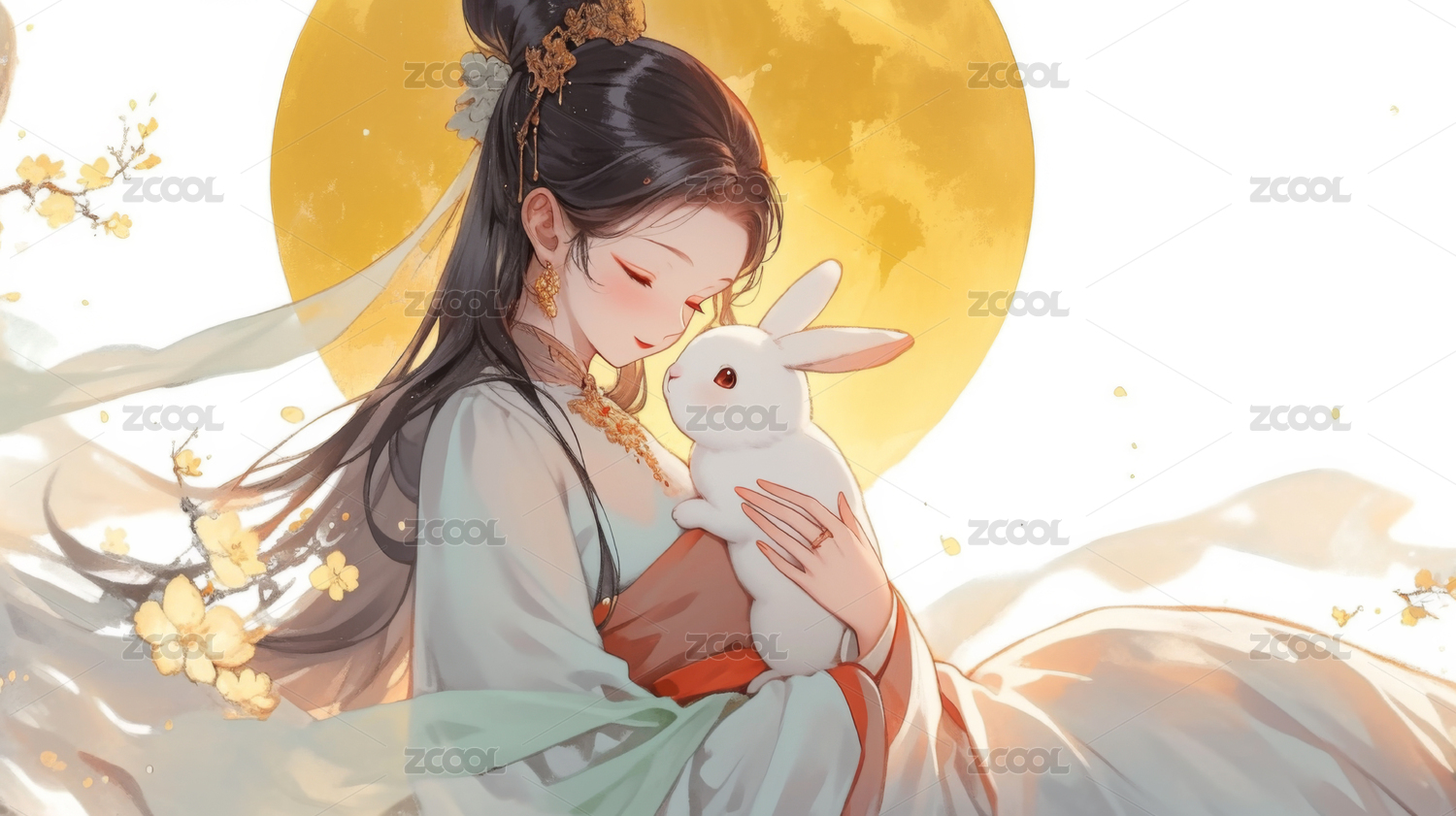 中秋节嫦娥玉兔月亮卡通漫画插画