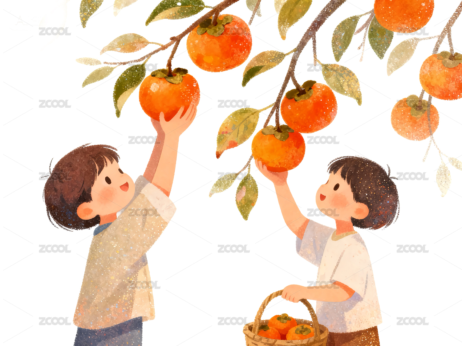 水墨画孩童摘柿子插画