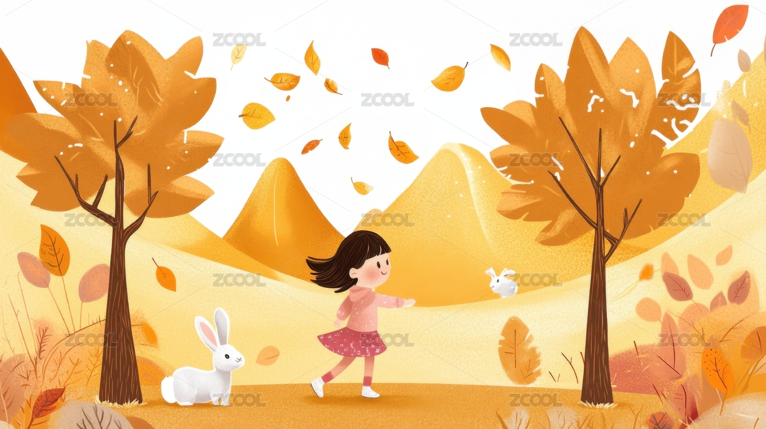 秋天自然户外小女孩卡通漫画插画