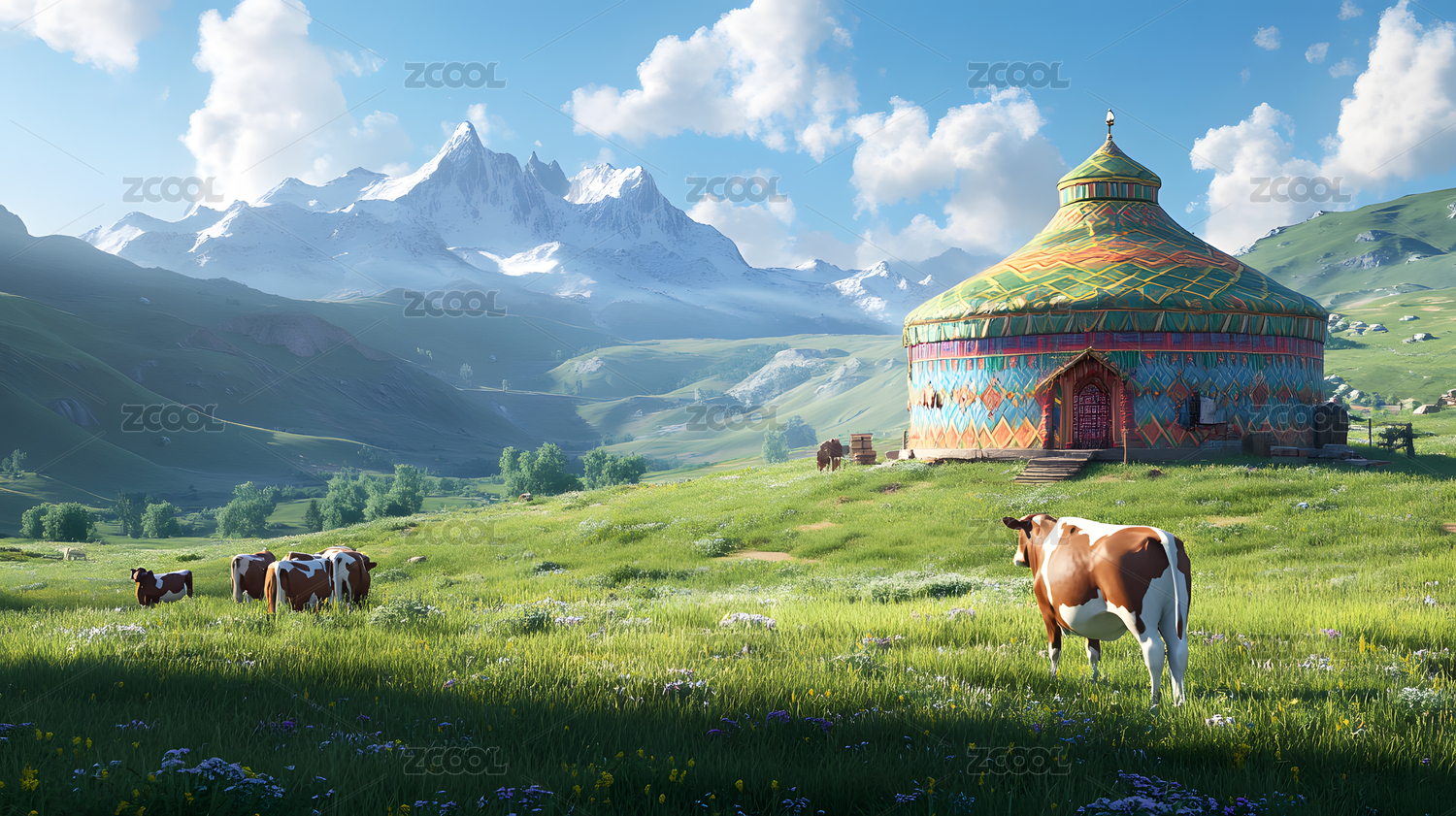 山谷中的蒙古包与奶牛