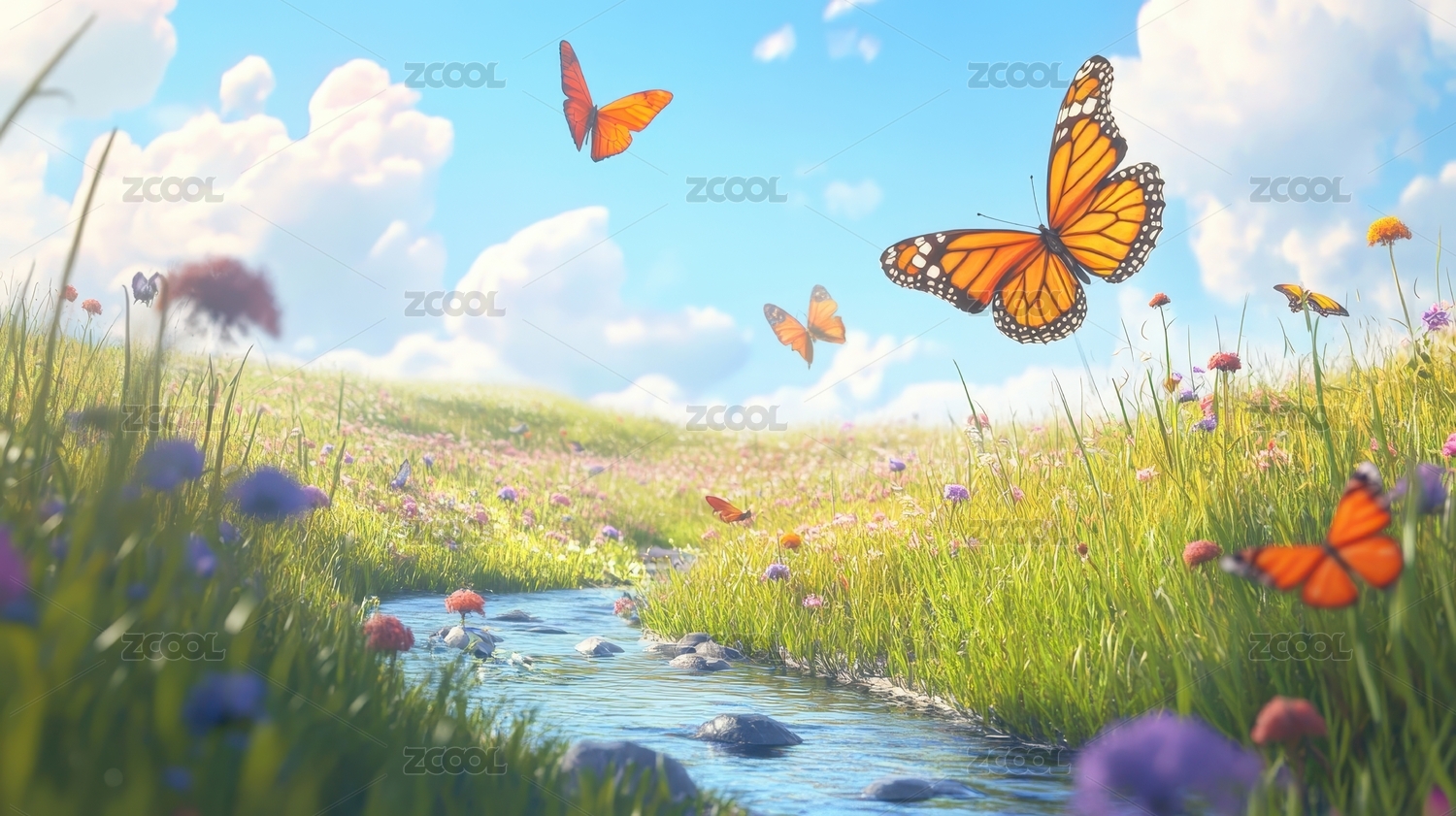 阳光明媚的草地,蝴蝶飞舞