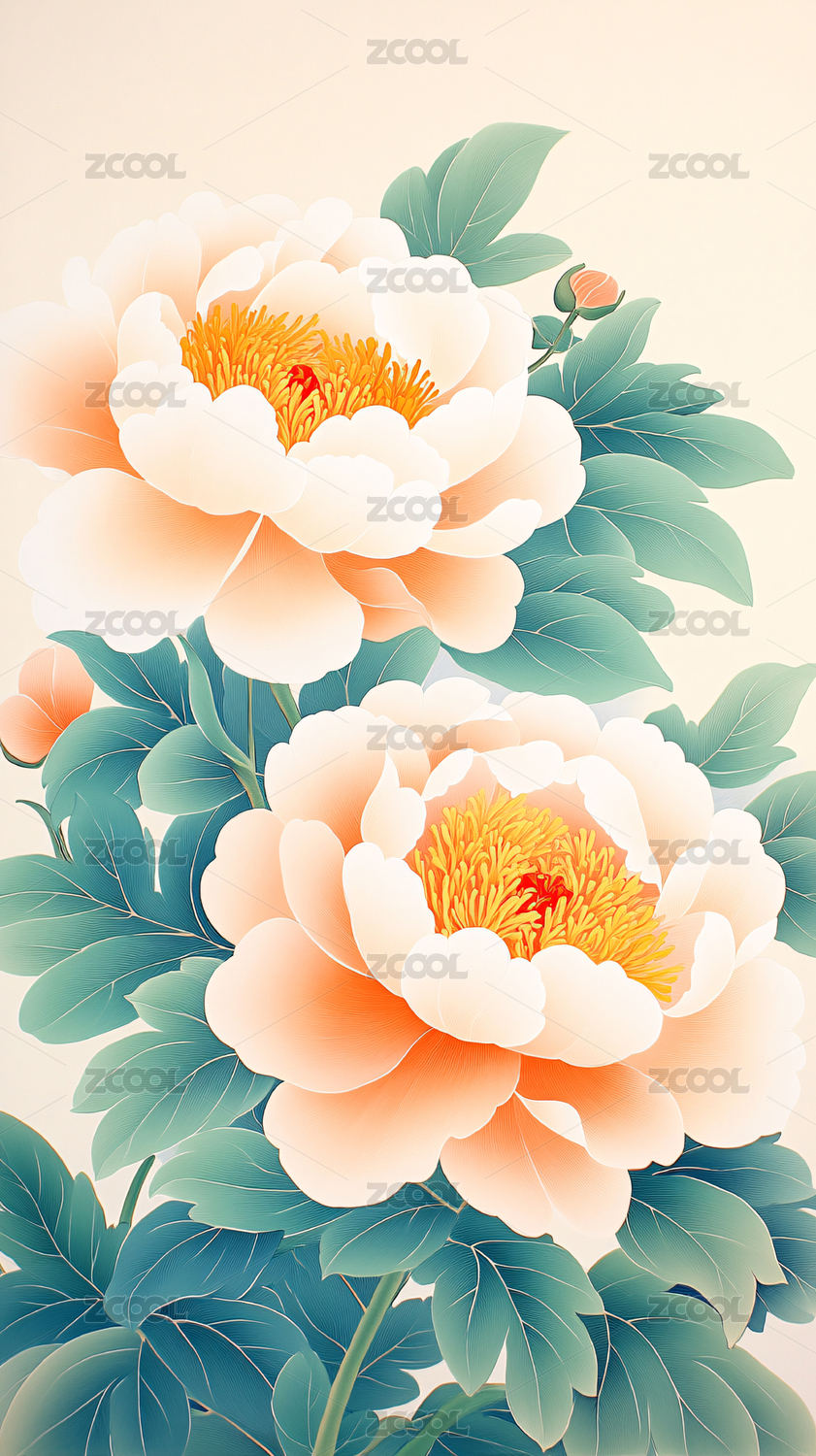 国潮牡丹花,中国风工笔画牡丹花卉插画