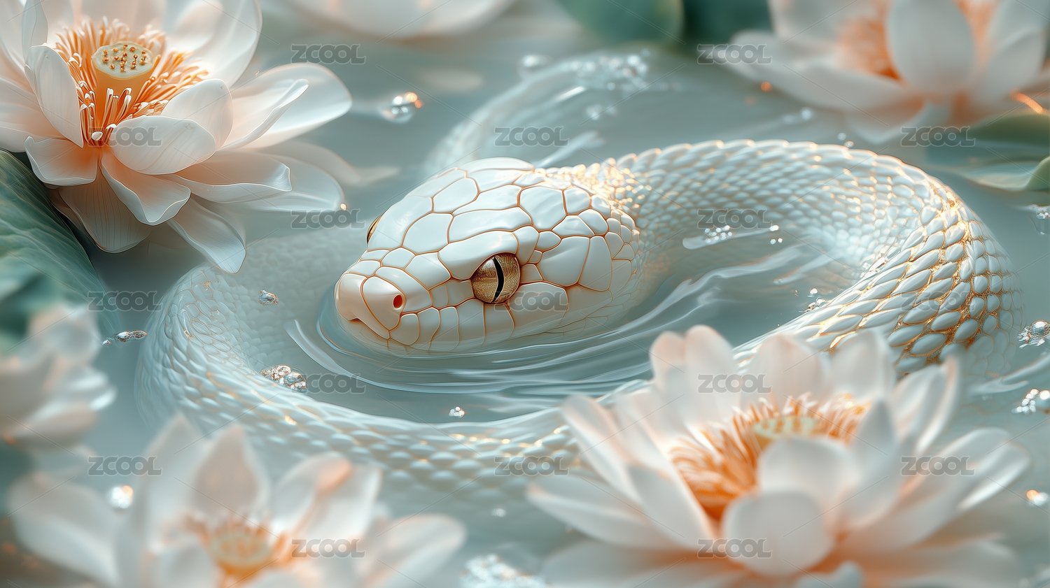 水面上莲花丛中的白蛇