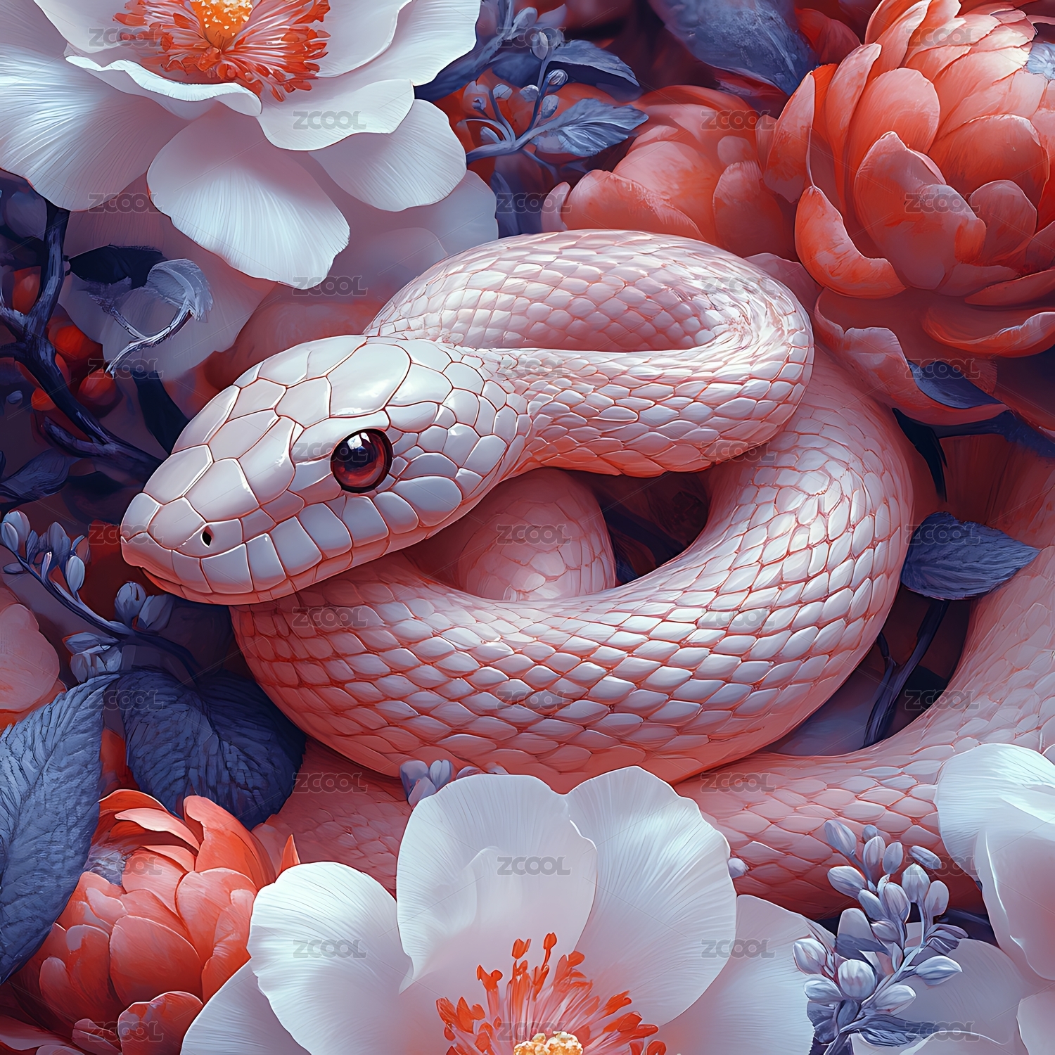 蛇和牡丹花插画