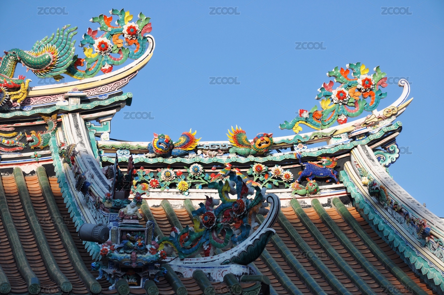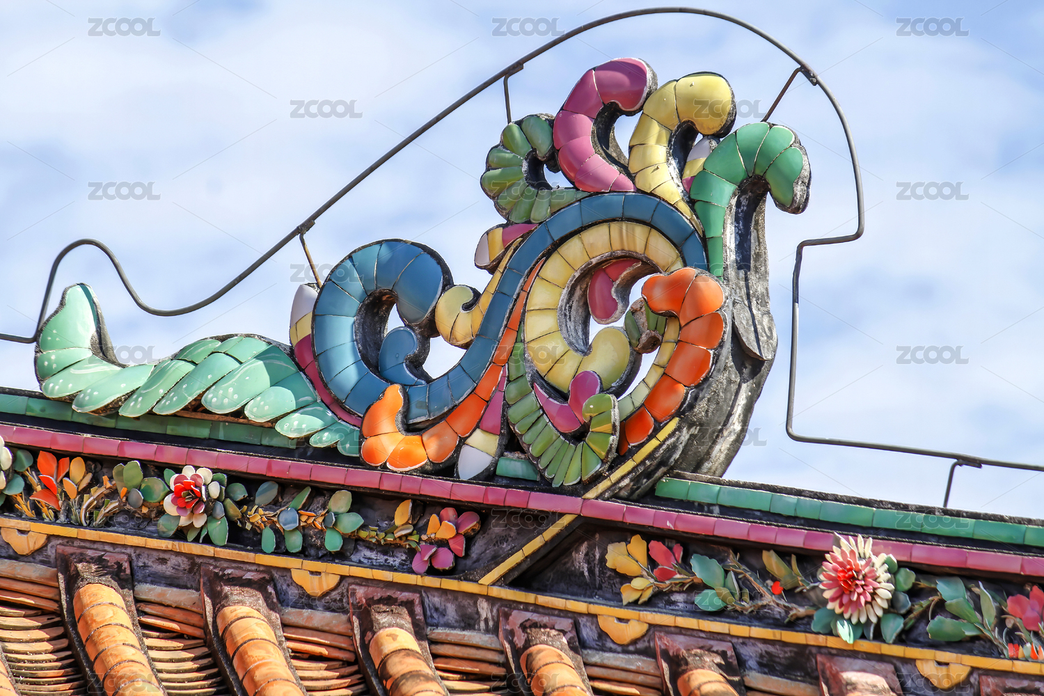 中国福州古建筑坡屋面顶的琉璃彩塑