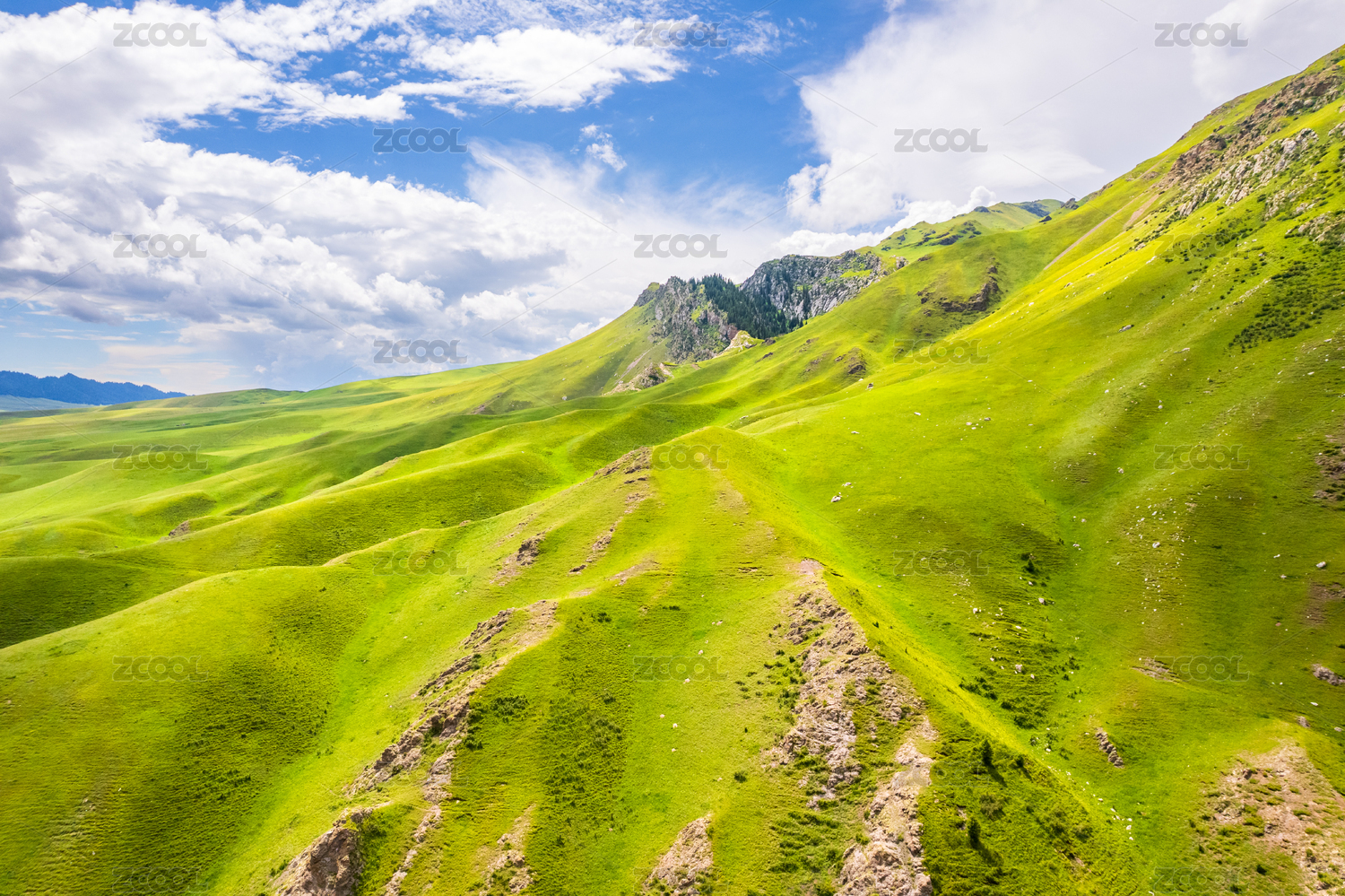 中国新疆夏季蓝天白云下G217独库公路沿途高山草原