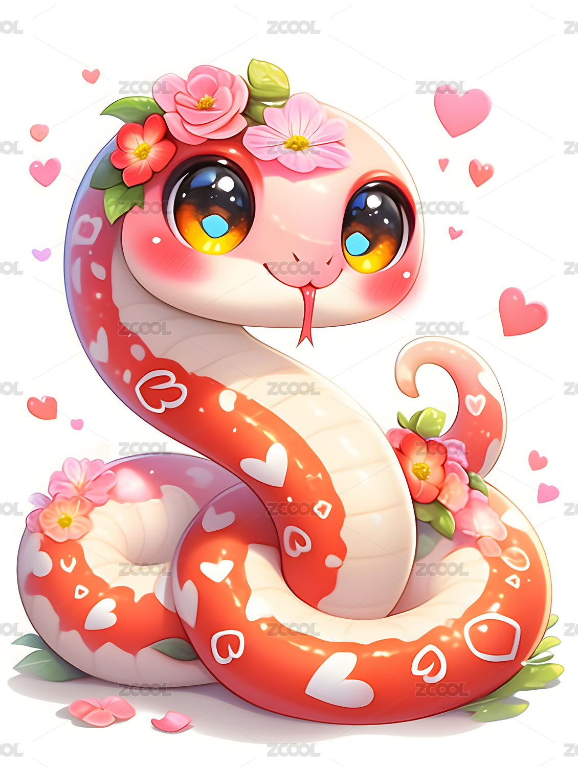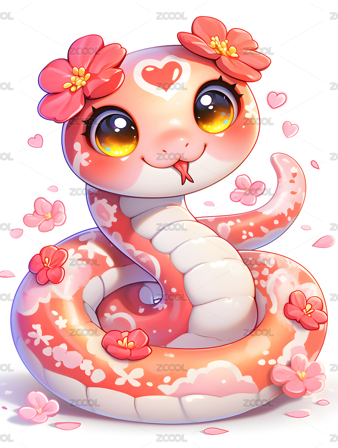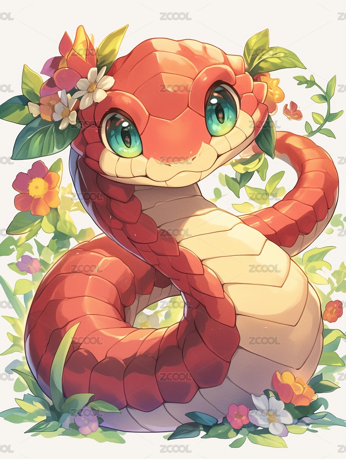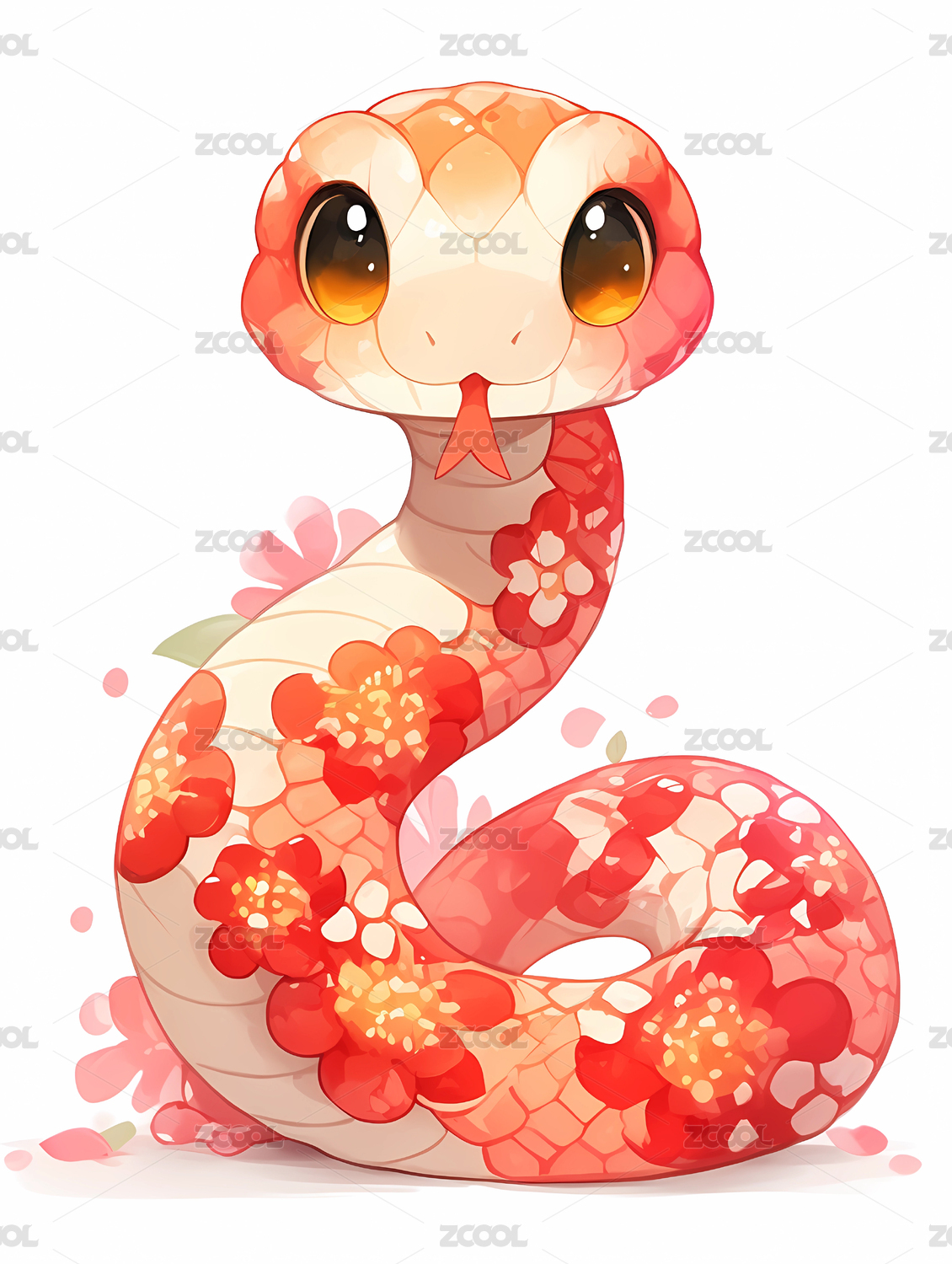 可爱开心的中国风花朵装饰卡通生肖蛇
