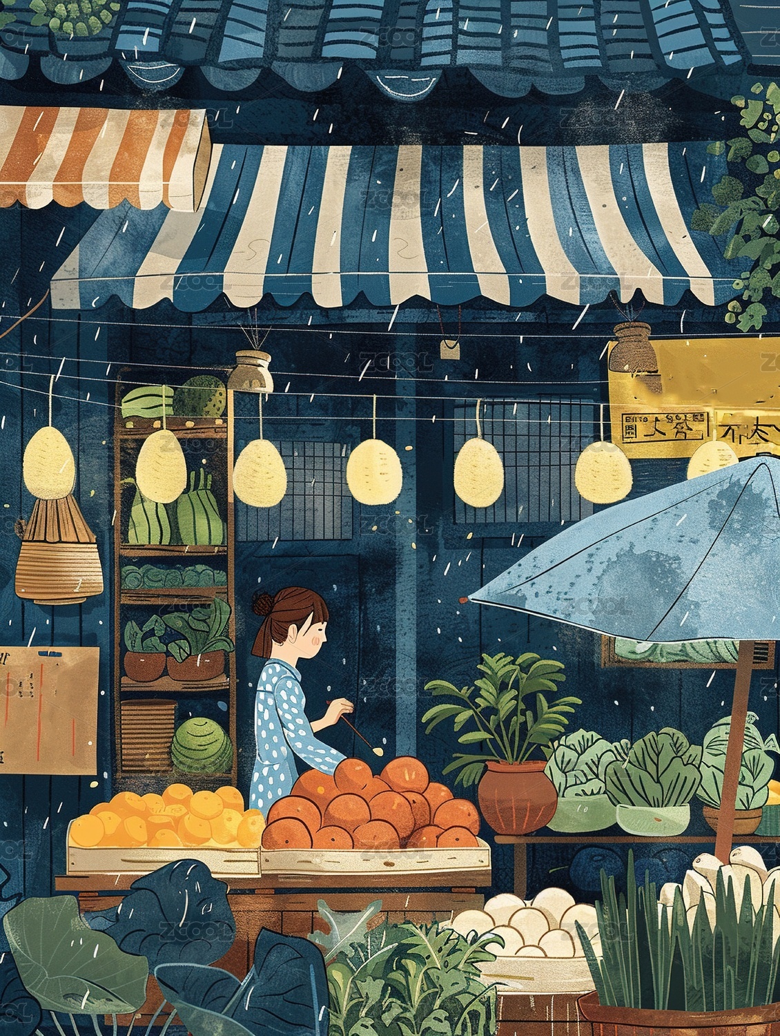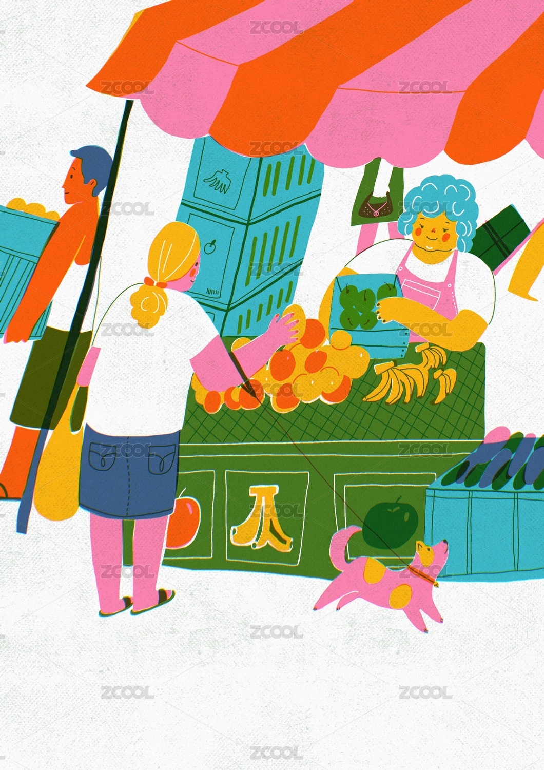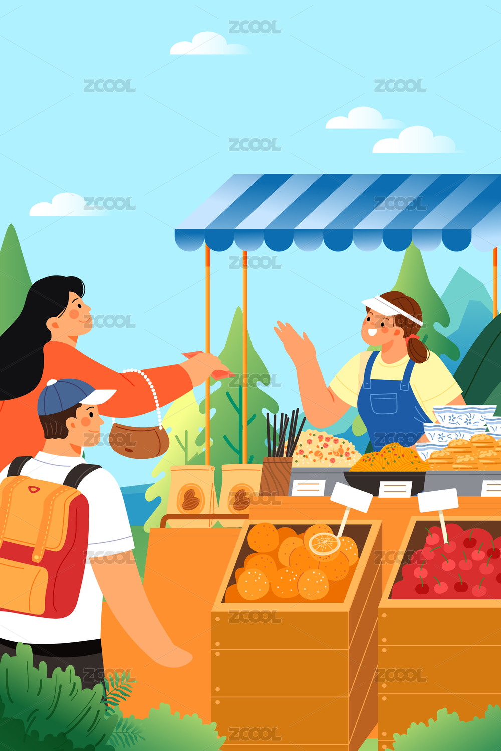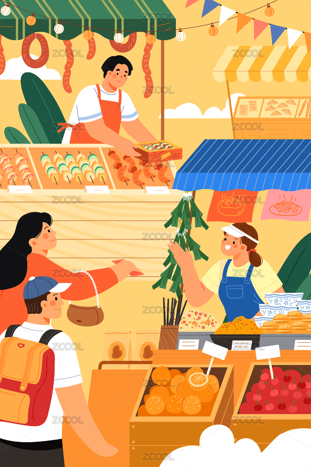 热闹赶集市菜市场摆摊卖买菜买卖水果市集