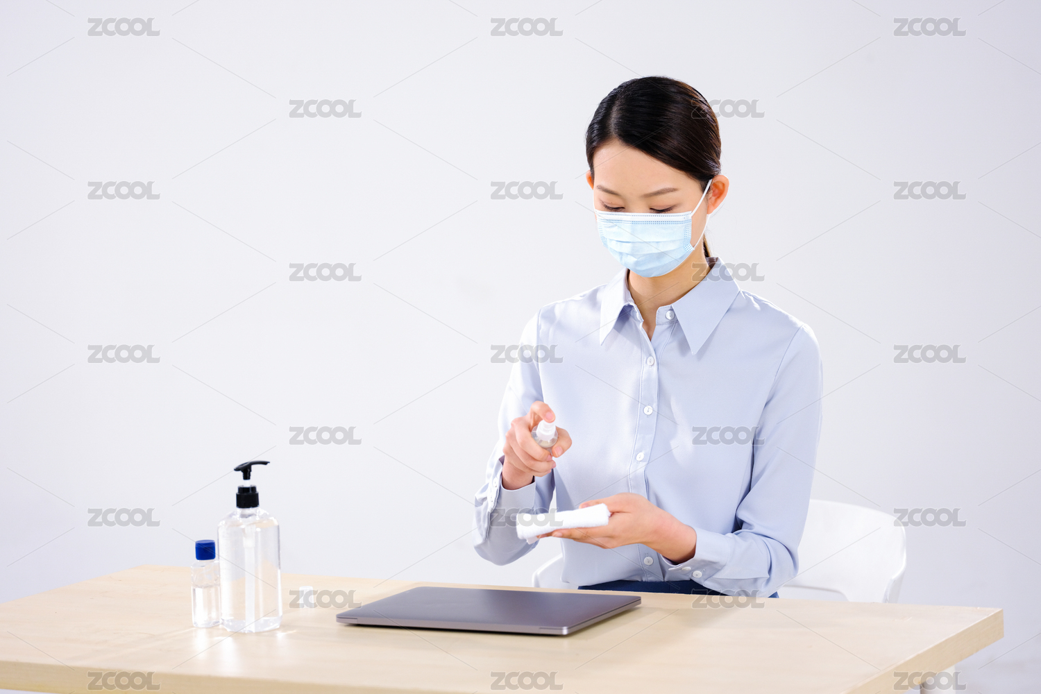 一位戴口罩的商务女士使用酒精擦拭电脑