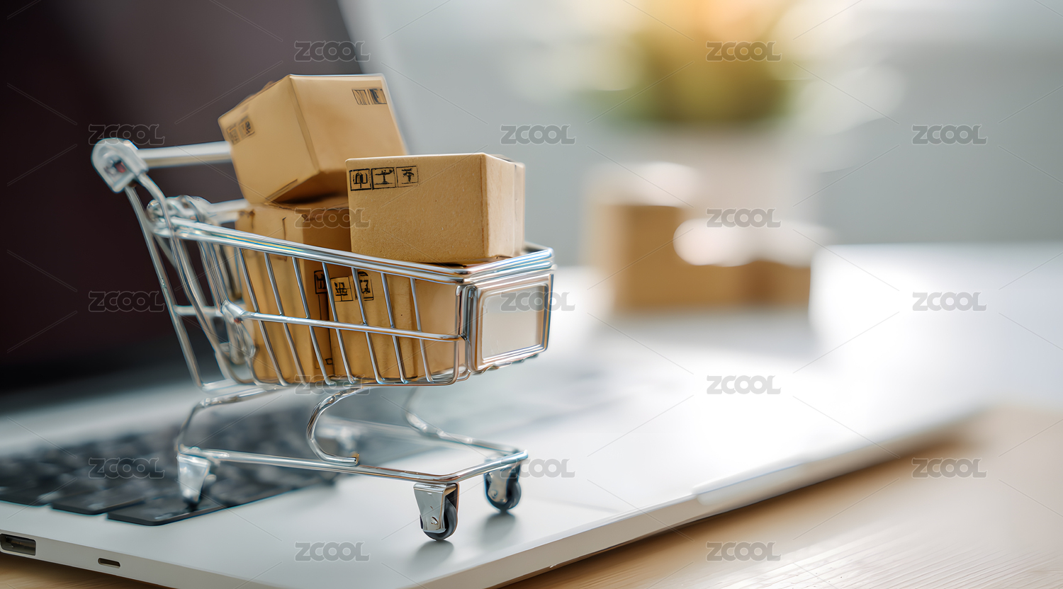装满箱子的购物车和电脑