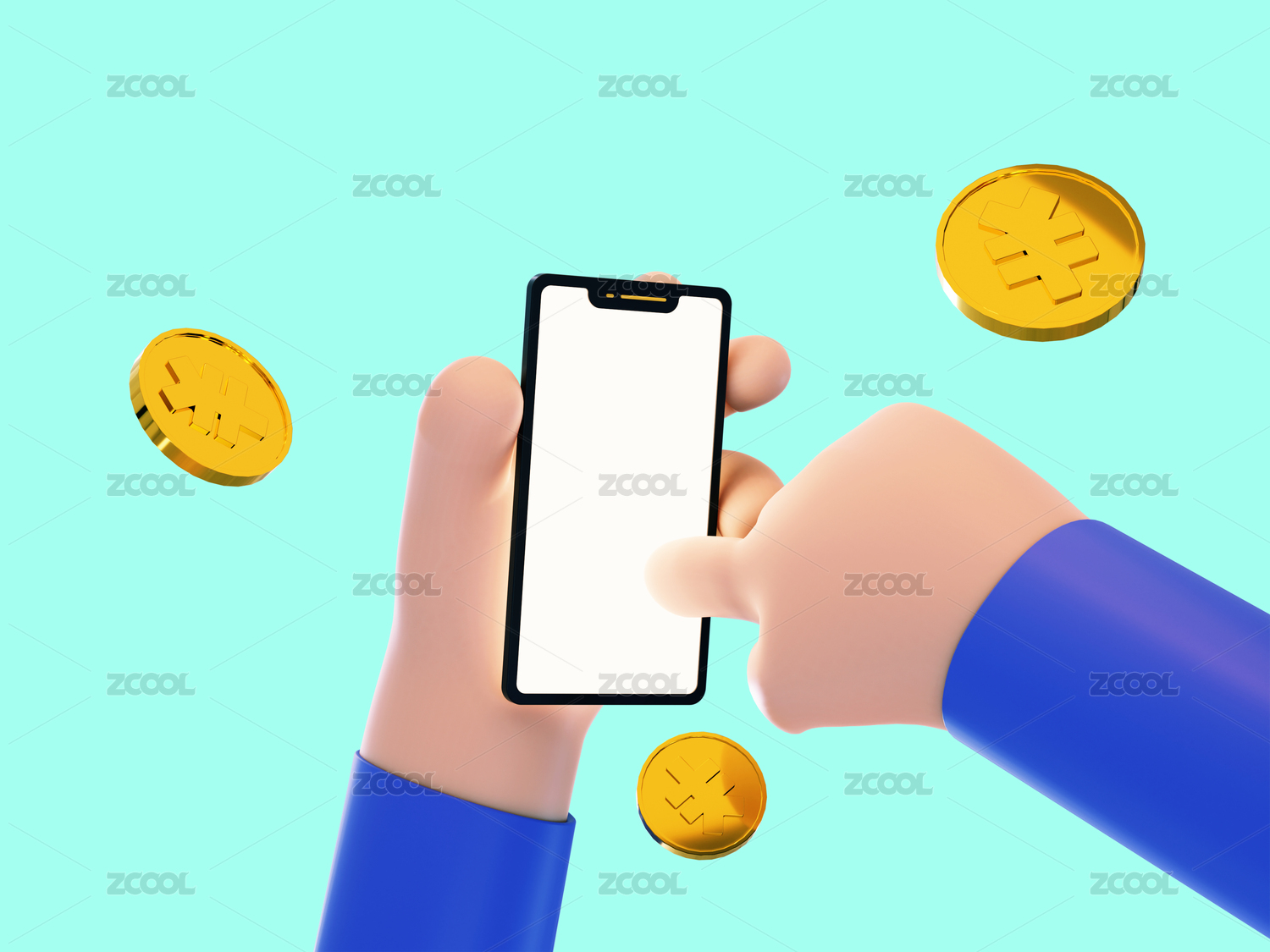 3D图标场景拿着手机点屏幕有金币飞出