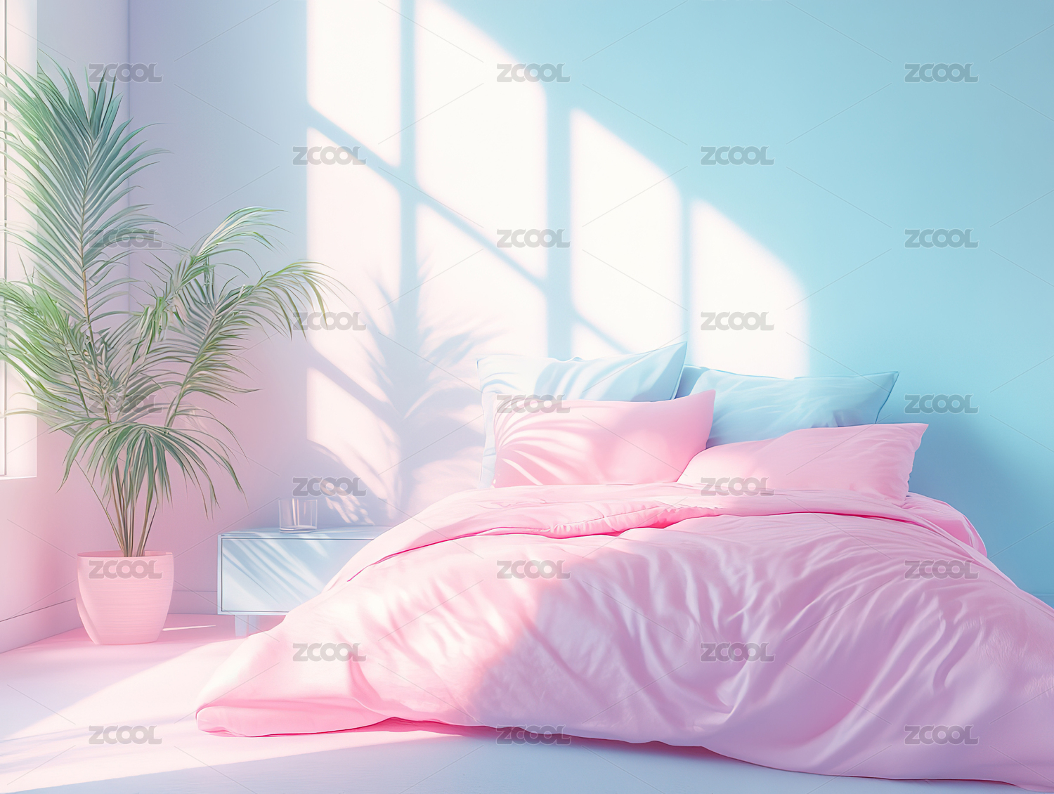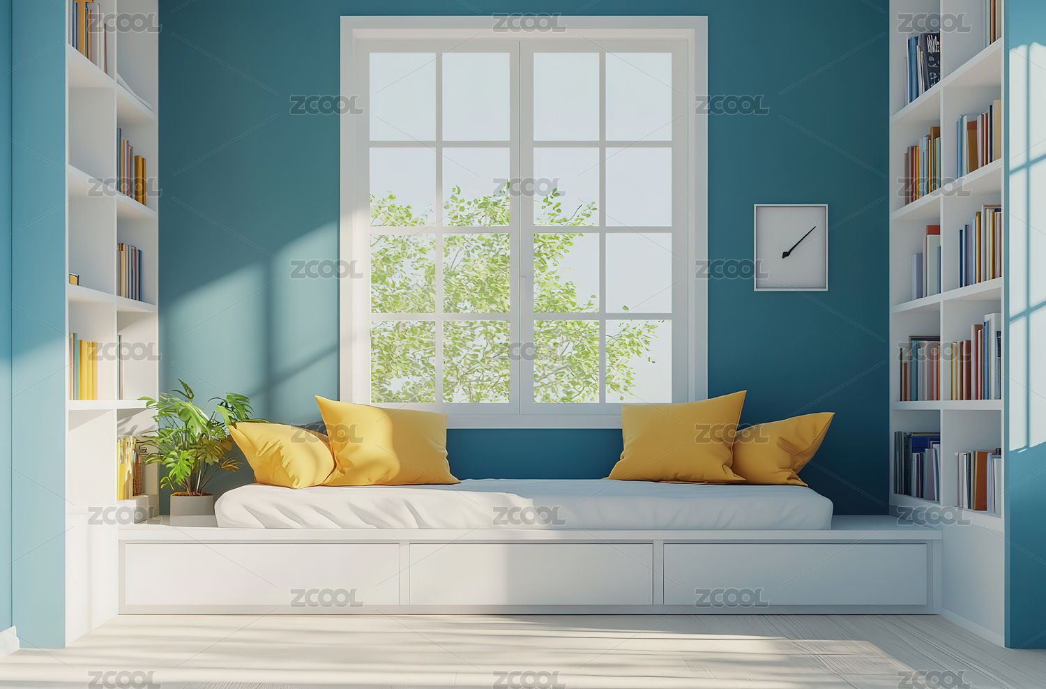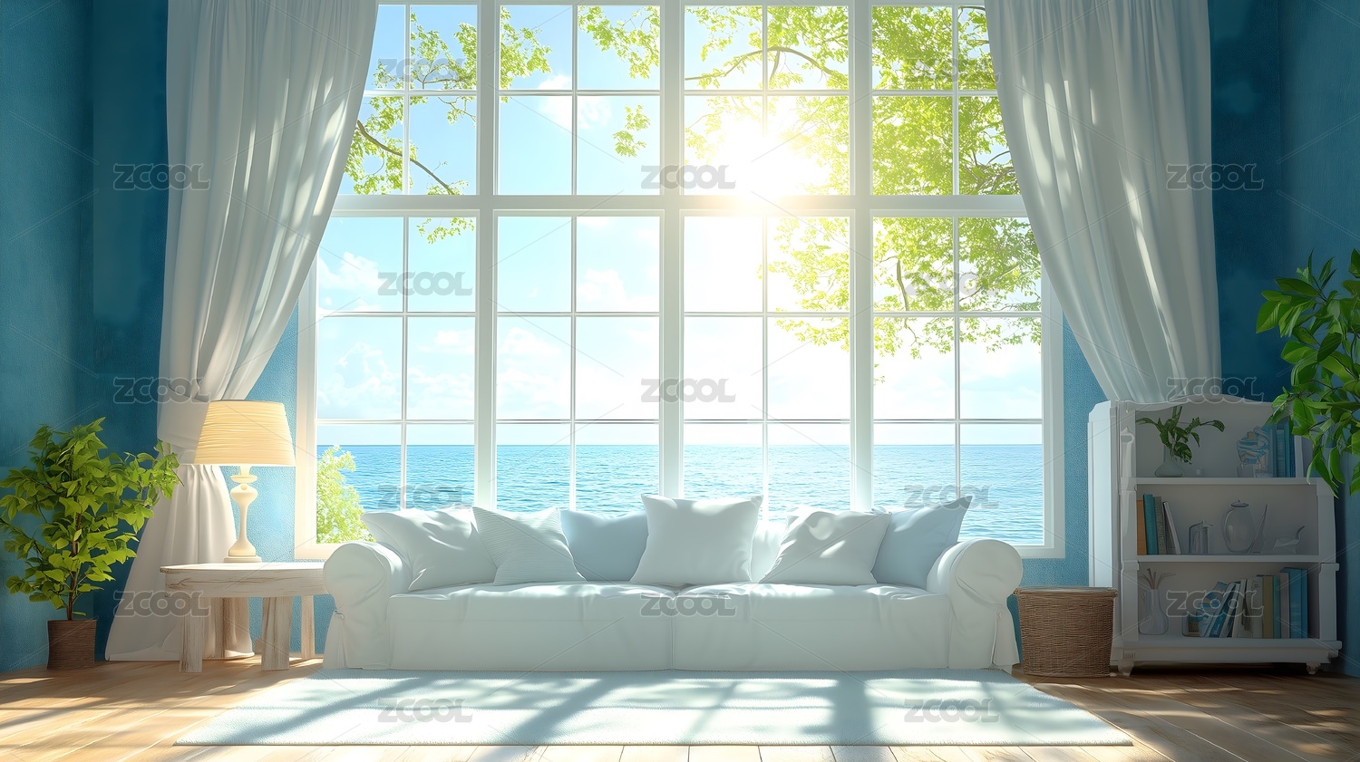 卧室,海景,现代,室内,设计,植物,蓝色,床,窗户,自然光