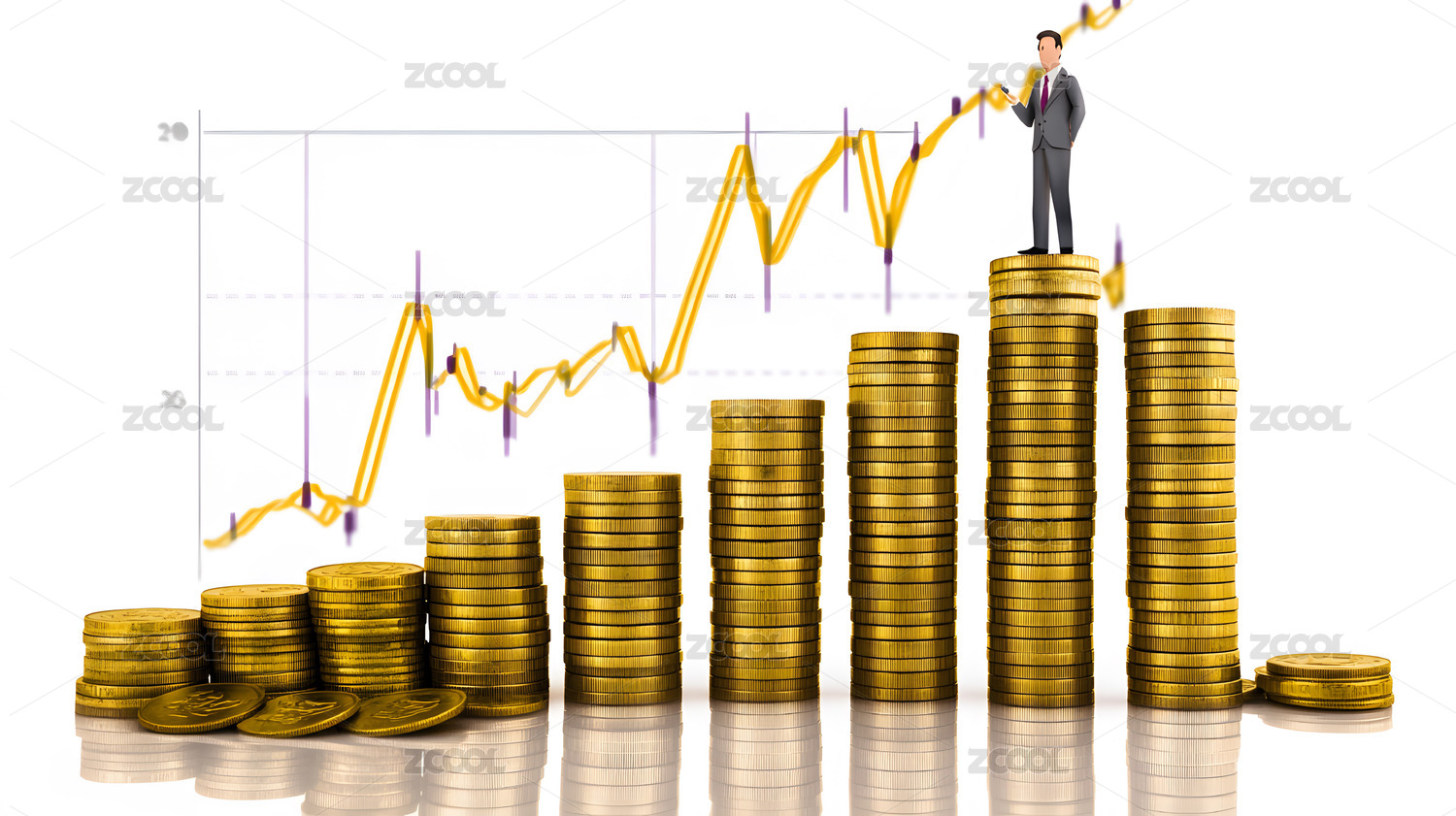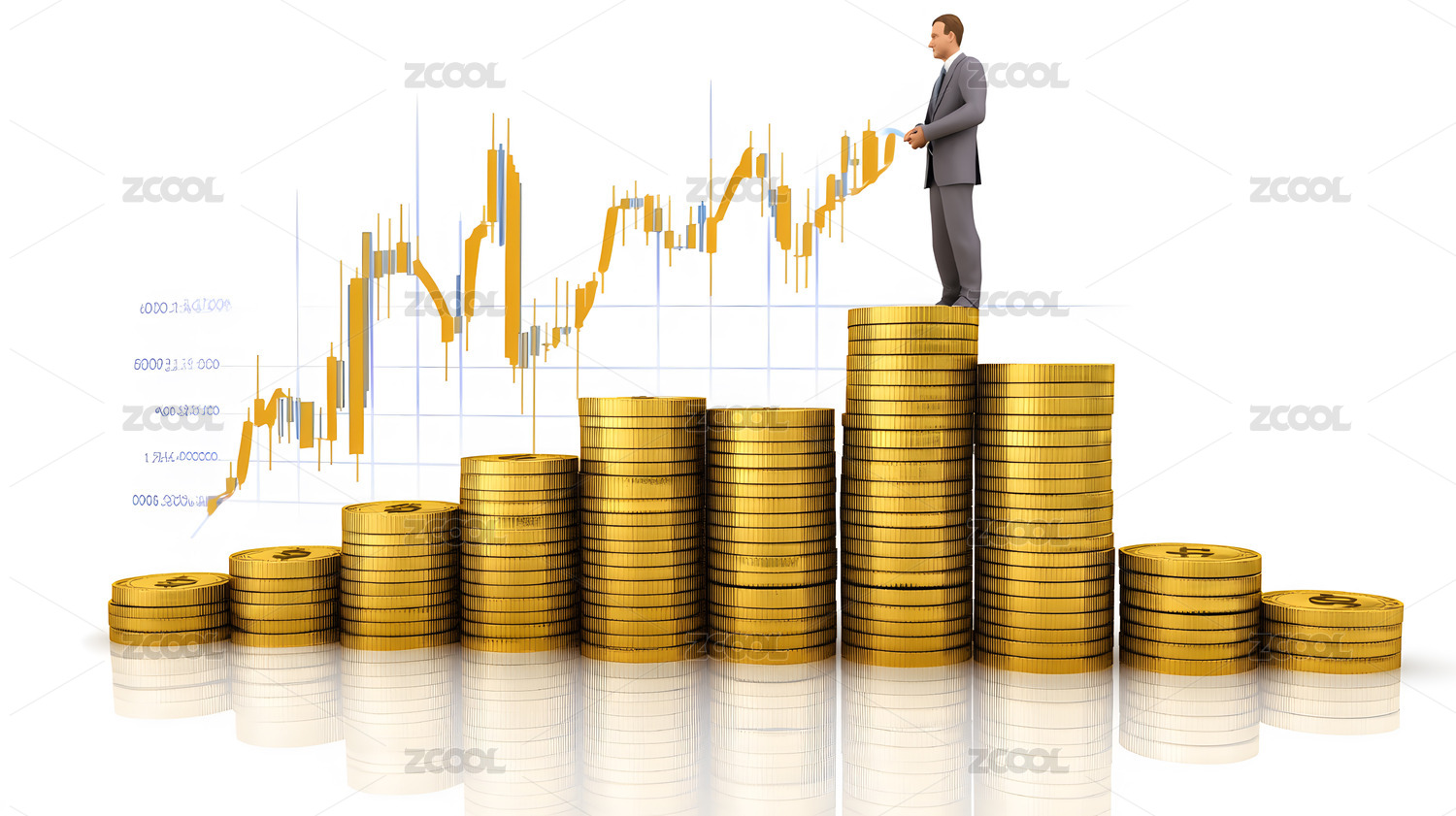 黄金币堆成的柱子上站西装人背景是交易曲线