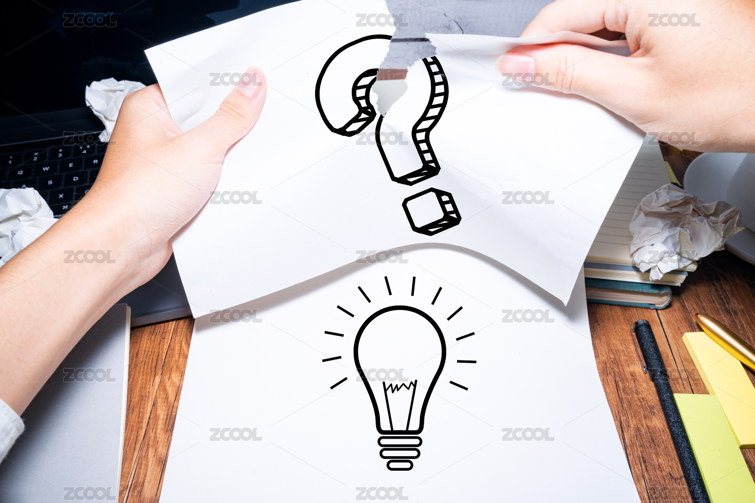 商务人士撕掉问号留下叹号灯泡概念