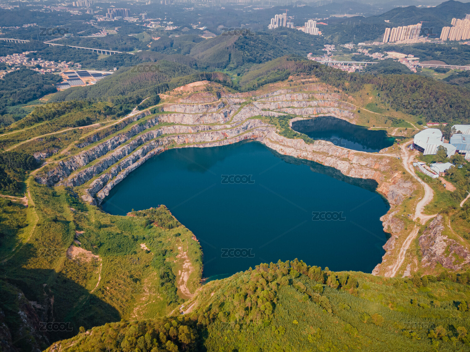 层叠矿石场下的碧绿色湖水